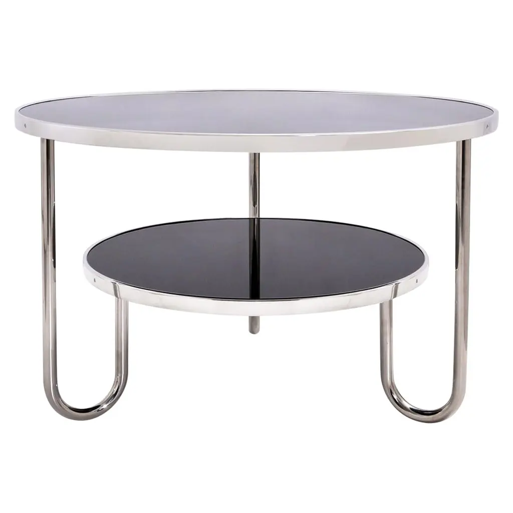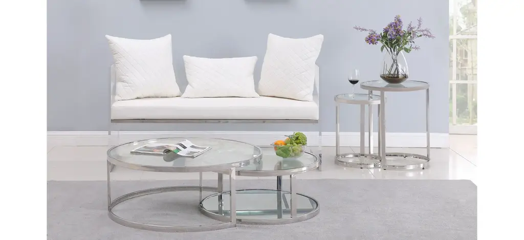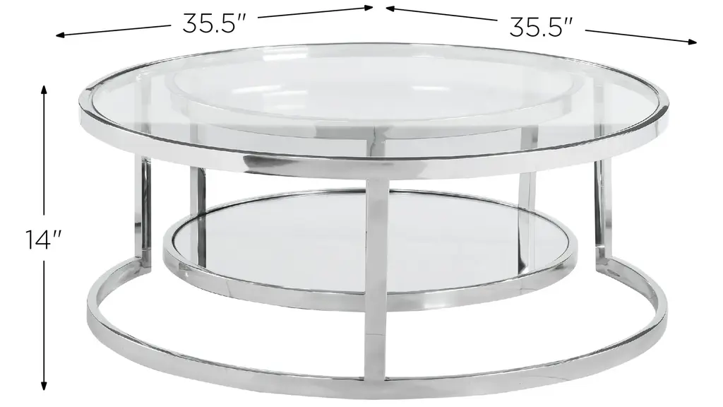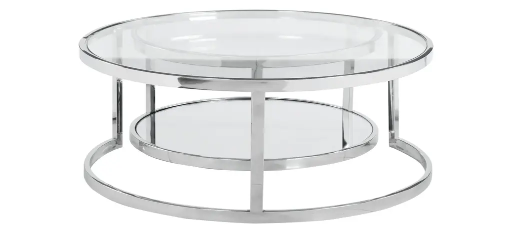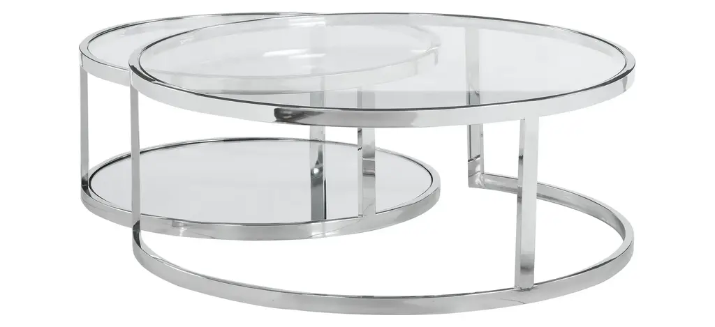 The contemporary Shirley Nesting Cocktail Table Set presents a nesting pair of round clear tempered thick glass top tables with a polished stainless-steel frame. The round base of the smaller table has a mirror bottom, closing this unique set for an interesting look that can make any home setting more appealing.