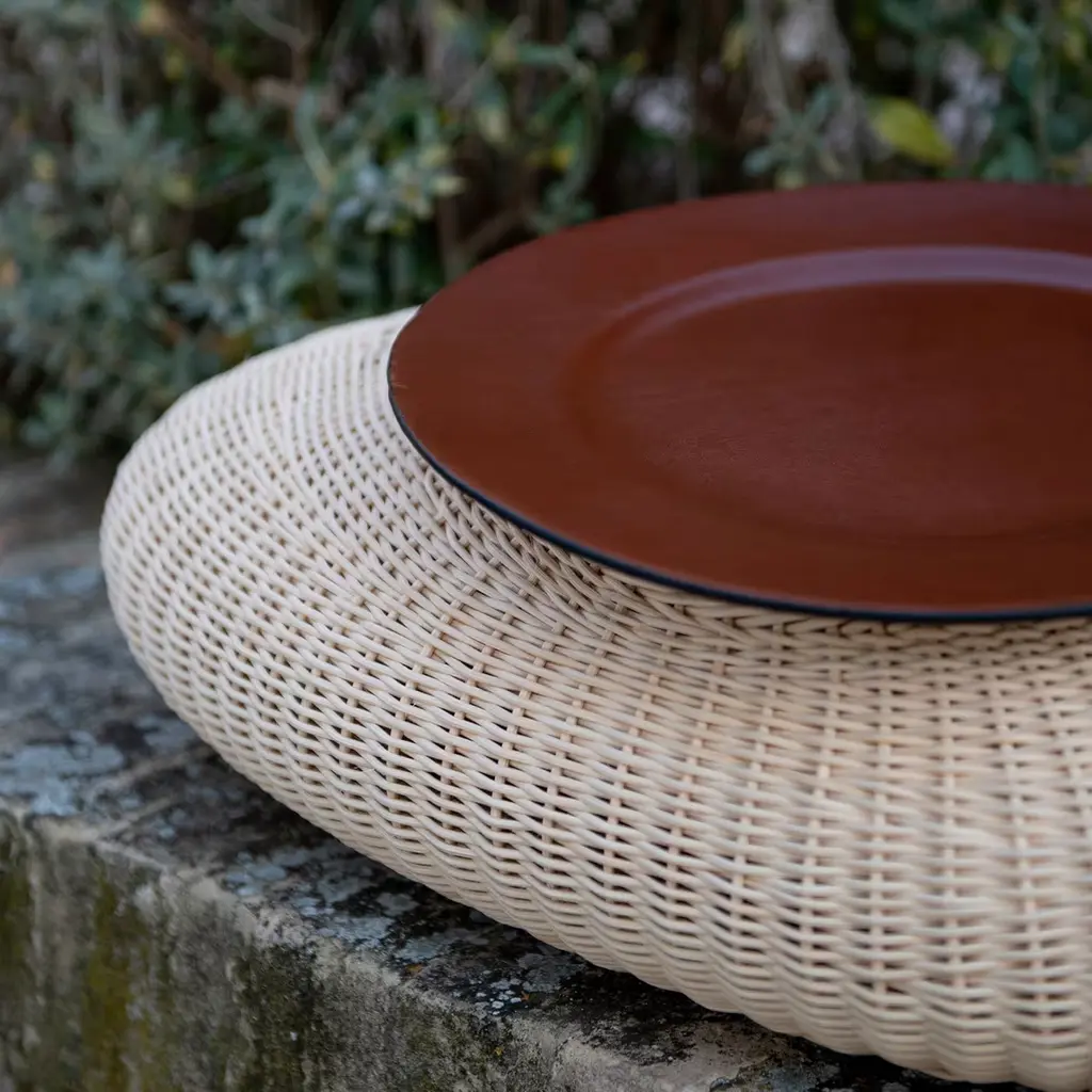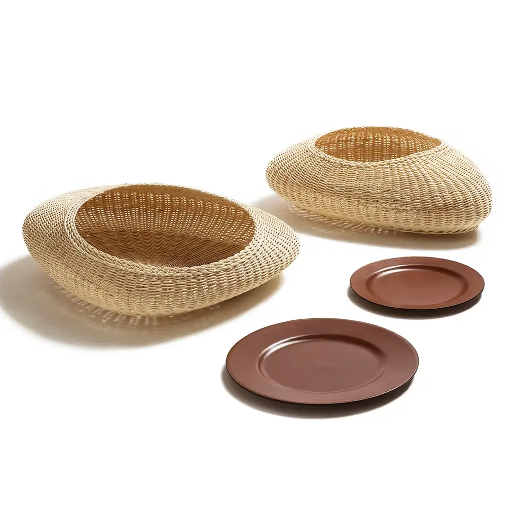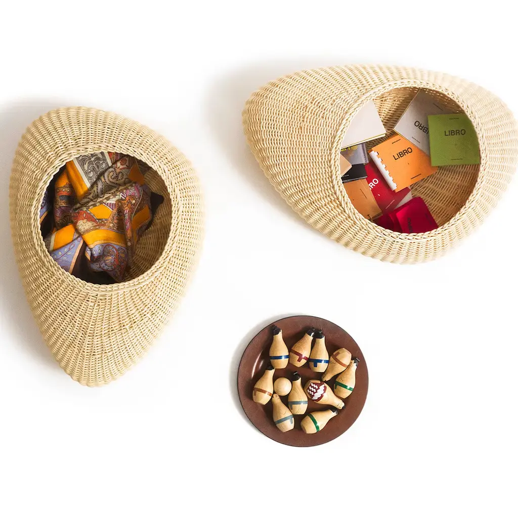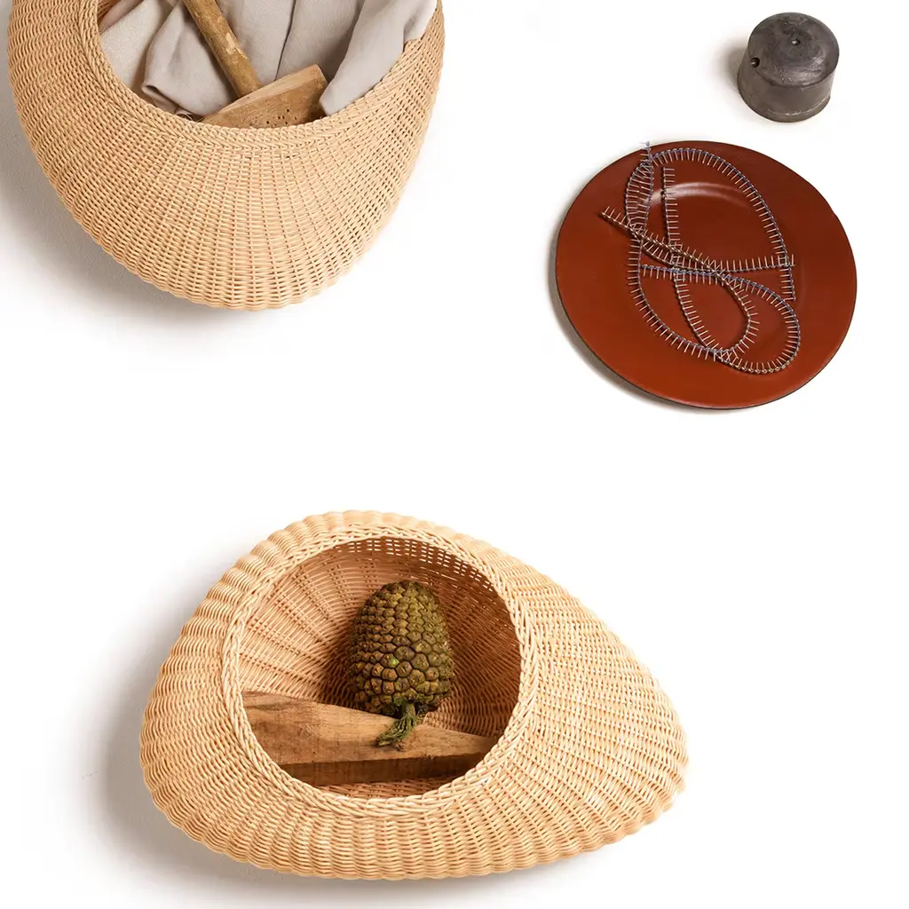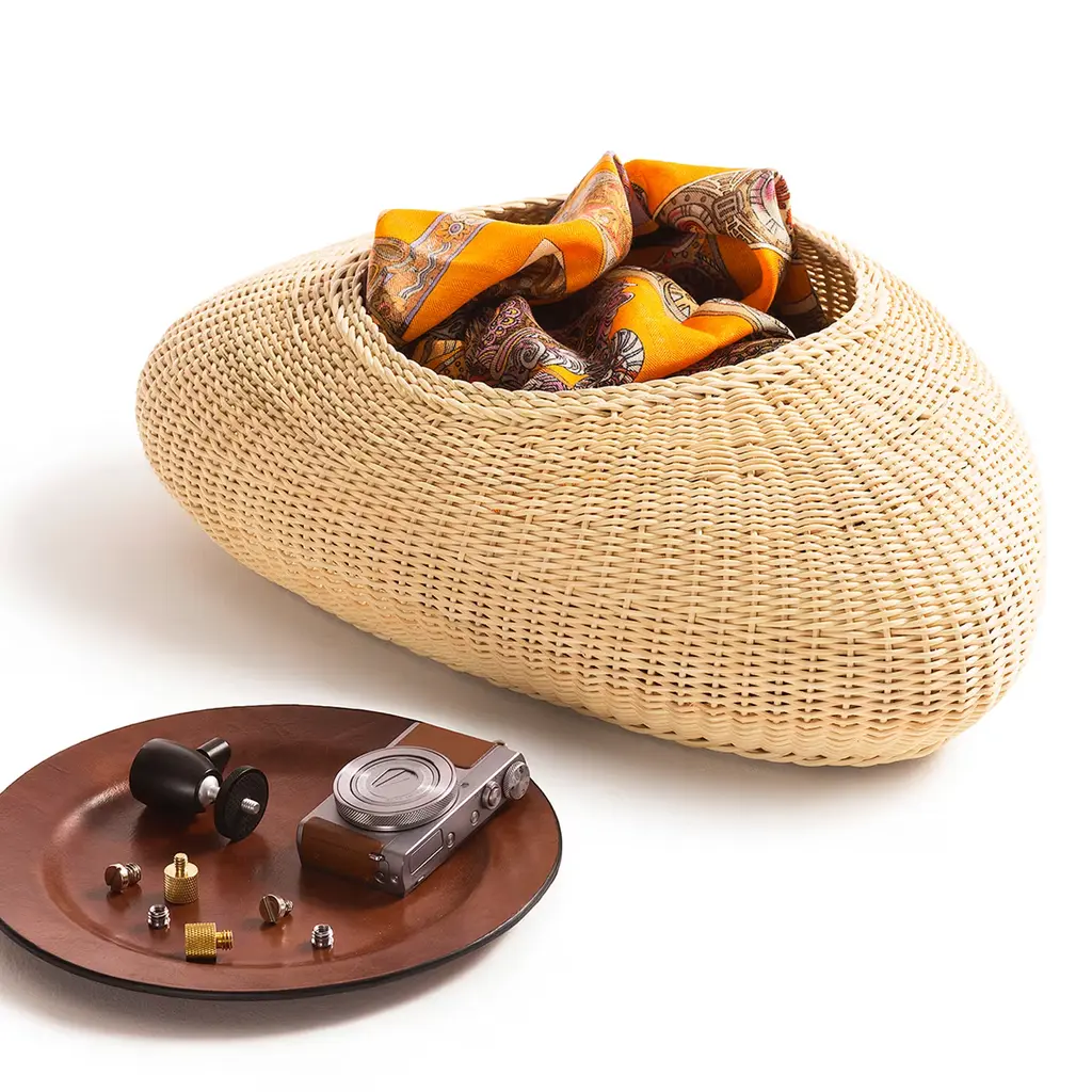 Shizè is a container with soft, organic shapes, entirely handwoven from natural rattan. It includes a leather lid that elegantly covers its opening. Inspired by river stones, its form reflects shapes softened over time by the flowing water.