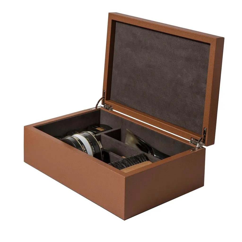 This elegant and functional box is equipped with all the necessary items to care for shoes: a shoehorn with a handmade Horn handle, two brushes, two small brushes for polishing, three jars with shoe conditioners, and three boxes with shoe polish. The box is lined inside in microfiber and outside in calfskin in the following finish: Liverpool (water- and scratch-resistant), Firenze (with a woven texture), Luxor (with a drummed surface), London (smooth and soft), and Ari (with a Galuchat finish).
