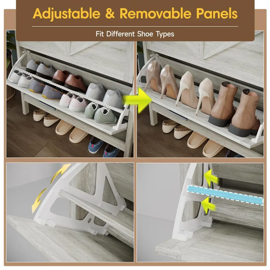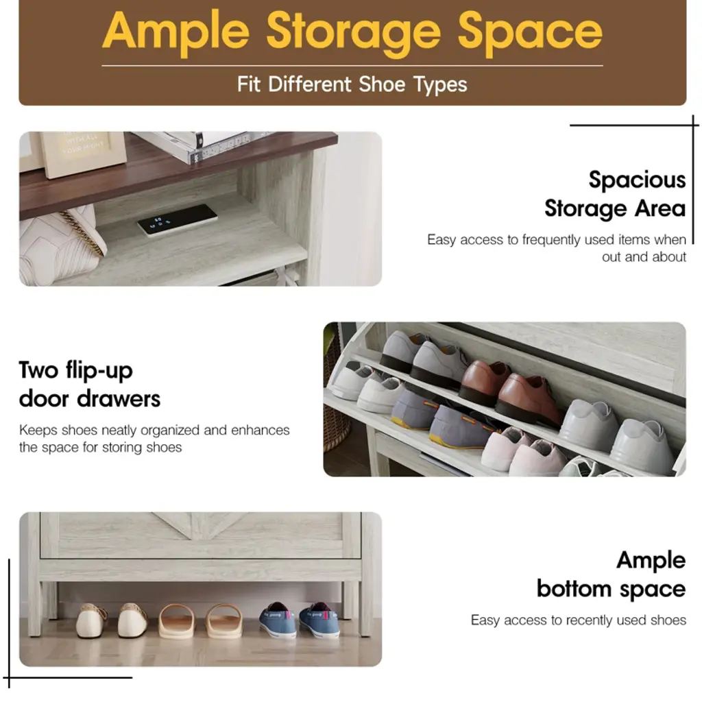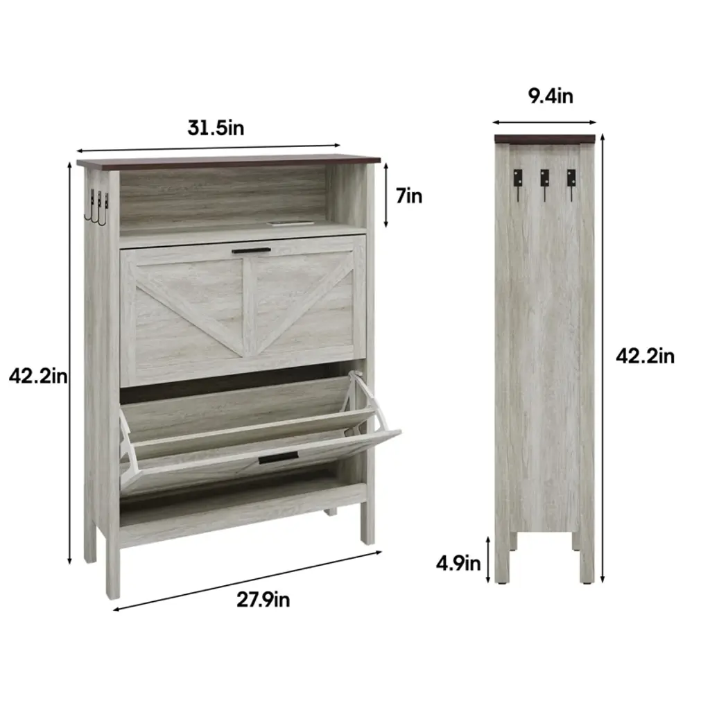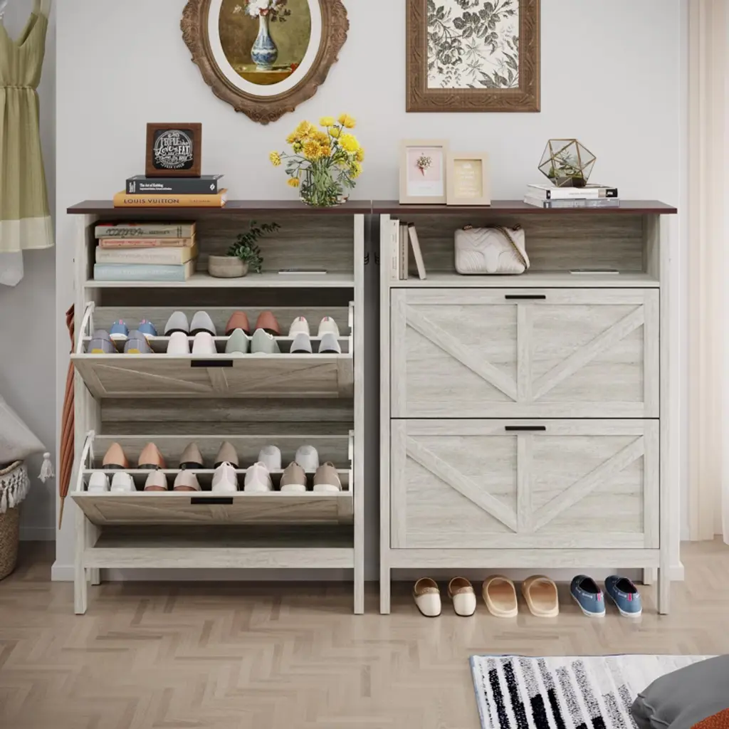 The contemporary freestanding shoe cabinet adopts the space-saving design of flip drawers, which are effortless to open and close. In comparison to traditional shoe racks, this narrow shoe cabinet can be positioned in confined spaces, keeping your shoes dust-free and safeguarding them from being bitten by pets and bugs