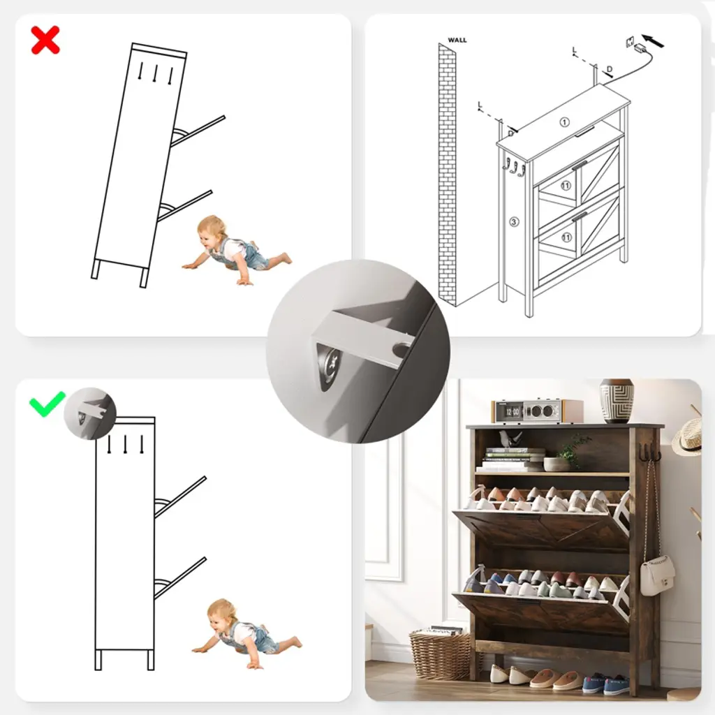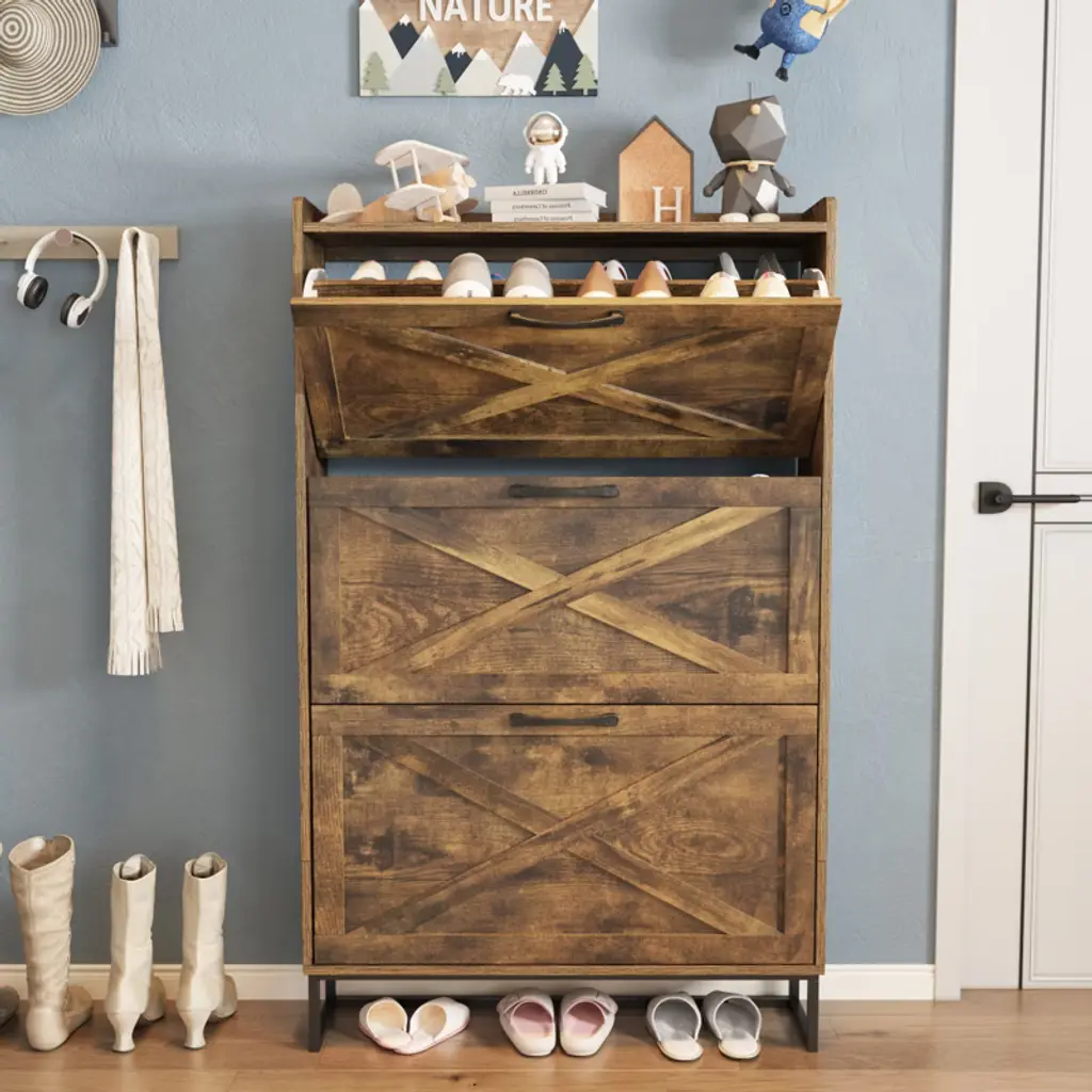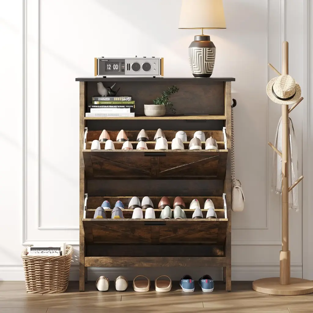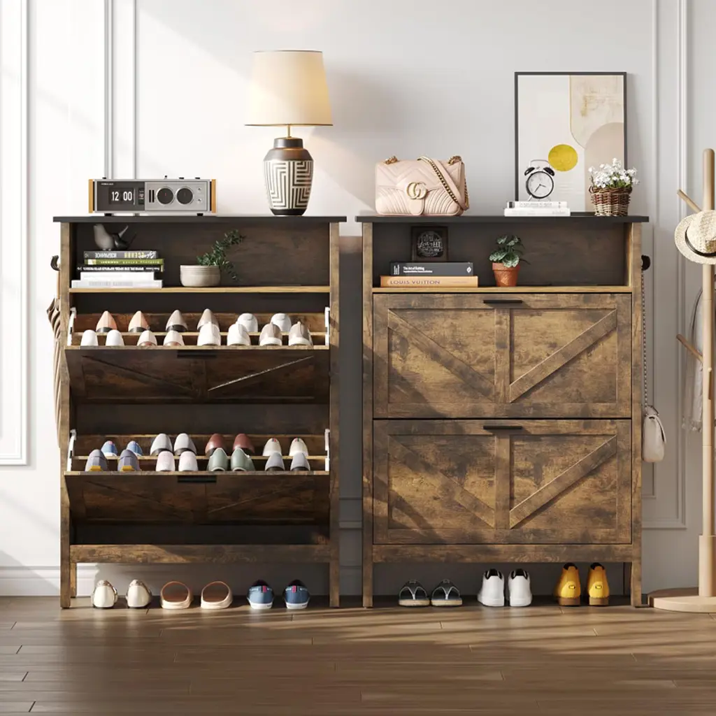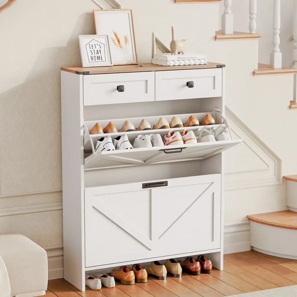 The contemporary freestanding shoe cabinet adopts the space-saving design of flip drawers, which are effortless to open and close. In comparison to traditional shoe racks, this narrow shoe cabinet can be positioned in confined spaces, keeping your shoes dust-free and safeguarding them from being bitten by pets and bugs