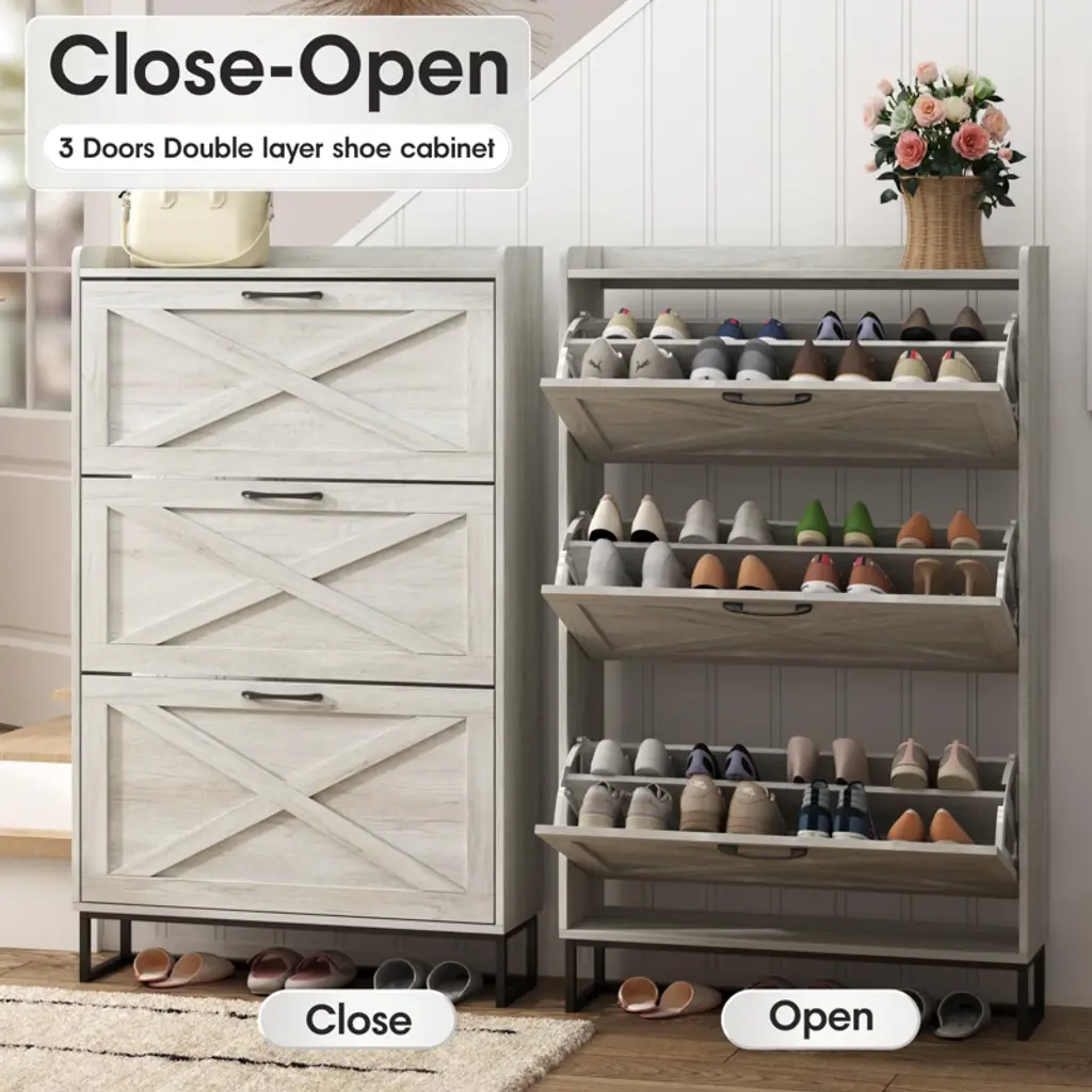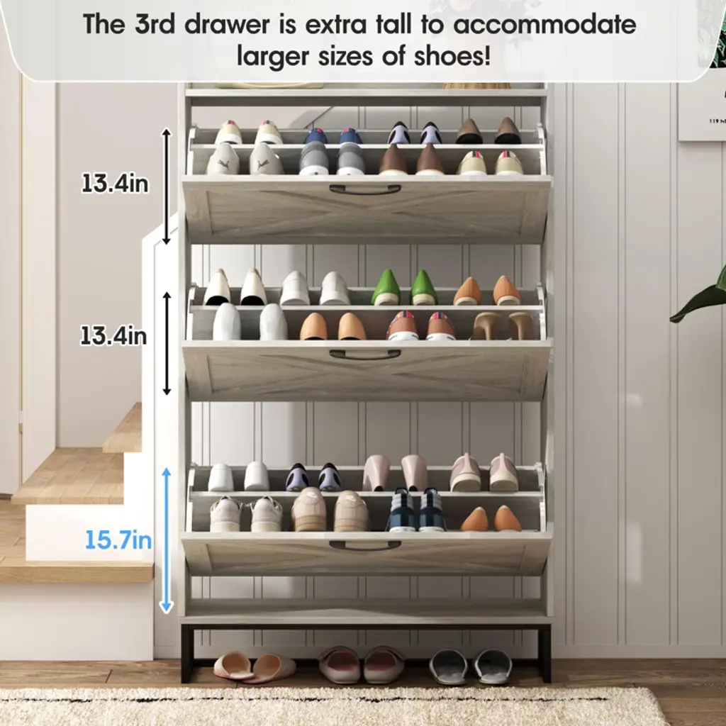 The drawer shoe cabinet can store up to 24 pairs. There are three upper and lower drawers, each drawer contains two layers of storage space. The panel can be adjusted or removed in two grooves to accommodate different heights and sizes of flats, mid boots or heels! Slippers or sweeping robots can be placed on the bottom. There is a fence on the top, ideal for placing potted plants, ornaments, socks and keys, without worrying about falling.Perfect for placing in the entryway, hallway, living room, or porch, provides a neat looking in your home and space saving
