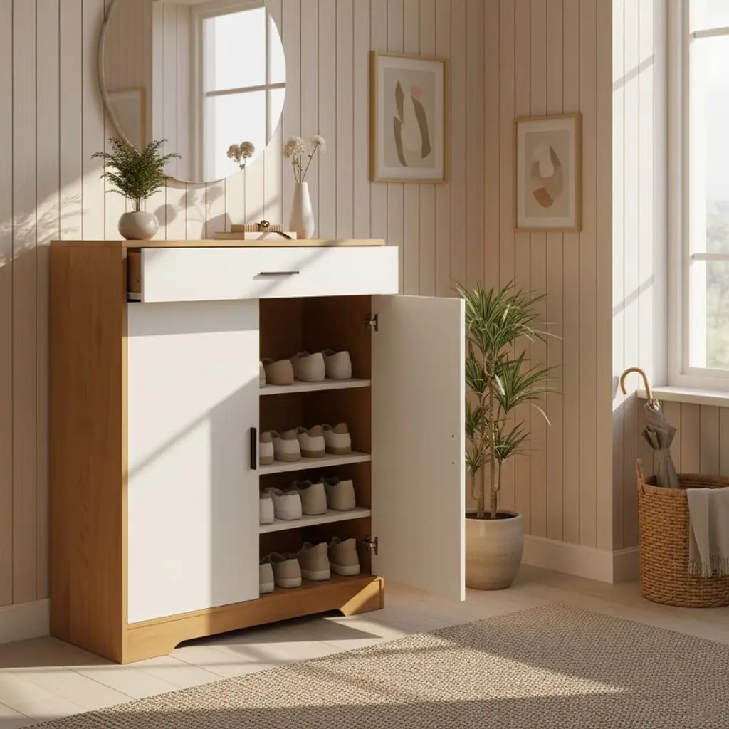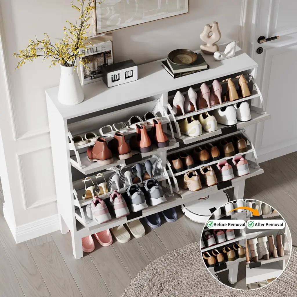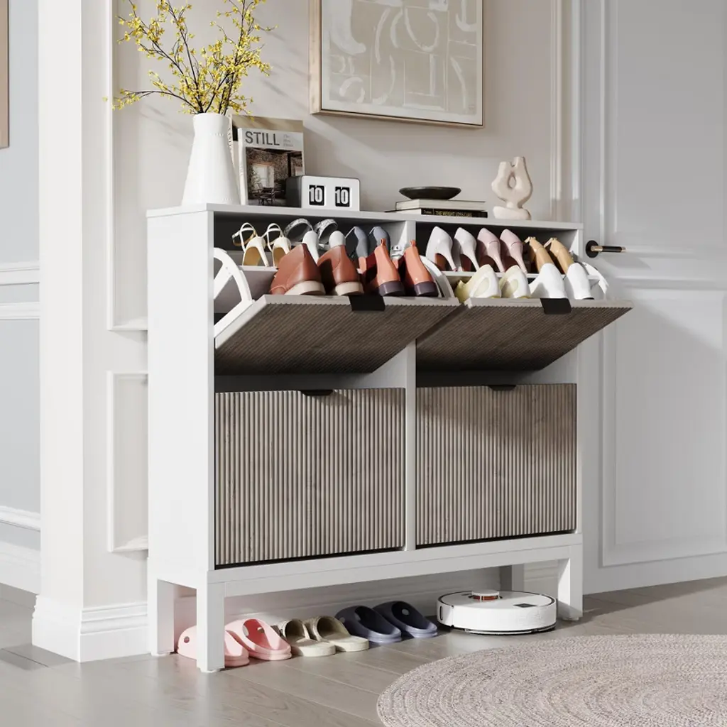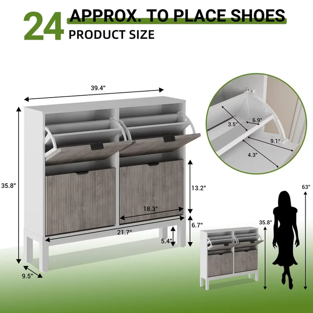 TROPOW Shoe Storage Cabinet with 2 Flip Drawers & 1 Sliding Drawer ¨C Adjustable Shelves, Space-Saving Entryway OrganizerMaximize your entryway space while keeping your shoes organized and easily accessible with the TROPOW Shoe Storage Cabinet. This slim, stylish cabinet accommodates 12-20 pairs of shoes and features adjustable shelves to suit various shoe types. Its sleek design is perfect for compact spaces while offering ample storage and protection for your footwear.Key Features: Ample Storage for Shoes & Accessories:Featuring 2/3/4 flip-top drawers and 1 sliding drawer, this space-saving cabinet provides the perfect solution for storing 12-20 pairs of shoes. The concealed sliding compartment is great for accessories like umbrellas, shoe care kits, and pet leashes, ensuring a tidy entryway. Customizable Storage with Adjustable Shelves:The flip-top drawers come with 3 customizable dividers, allowing you to easily organize flats, heels, boots, and more. The removable shelves offer flexible reconfiguration, letting you adapt the storage space as your footwear collection grows. Elegant & Modern Design:The cabinet features a beautiful fluted finish on the front panel, creating a refined texture. Its sleek, monochromatic sides combine modern simplicity with farmhouse charm. A small decorative plant on top enhances its inviting, functional look. Safe, Sturdy, and Long-Lasting:Constructed from premium MDF wood, the shoe cabinet is reinforced with adjustable feet and thickened supports for added stability on any surface. The anti-tipping kit ensures safety, while the robust design delivers exceptional load-bearing capacity for long-term use. Easy Assembly with Clear Instructions:All parts and tools are included for easy assembly, with clearly numbered components and step-by-step instructions to guide you. Should you have any questions, customer support is available to assist, with issues resolved within 24 hours. Product Specifications:AttributeDetailsBrandTROPOWProduct Dimensions (L x W x H)9.5" x 24" x 41.3"MaterialEngineered WoodStyle2/3/4 DrawersShapeRectangularNumber of Drawers1 Sliding Drawer + 2/3 Flip-Top DrawersAdjustable ShelvesYes, with 3 customizable dividersStorage CapacityHolds 12-20 pairs of shoesSpecial FeaturesAdjustable feet, anti-tipping kitMounting TypeFloor MountAssembly RequiredYes, with instructions includedCare InstructionsWipe clean with a damp clothTransform your entryway into an organized and stylish space with the TROPOW Shoe Storage Cabinet. Combining functionality, elegance, and flexibility, this cabinet is the perfect solution for any home with limited space. Whether you're storing shoes, umbrellas, or accessories, this cabinet offers everything you need to stay organized.