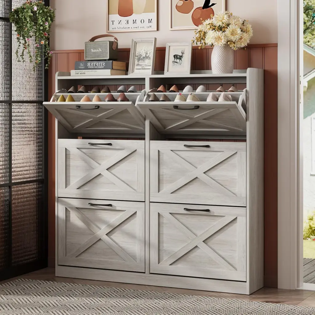 The drawer shoe cabinet can store up to 36-40 pairs. There are 6 upper and lower drawers, each drawer contains two layers of storage space. The panel can be adjusted or removed in two grooves to accommodate different heights and sizes of flats, mid boots or heels! There is a fence on the top, ideal for placing potted plants, ornaments, socks and keys, without worrying about falling.Perfect for placing in the entryway, hallway, living room, or porch, provides a neat looking in your home and space saving.