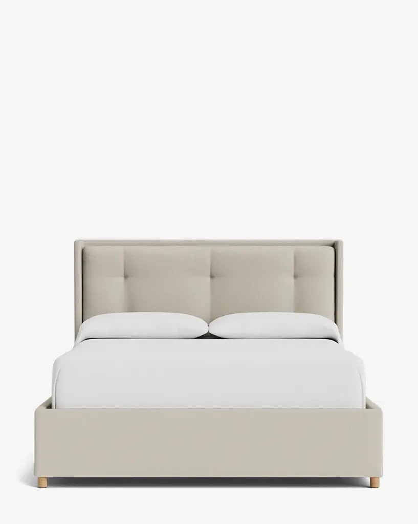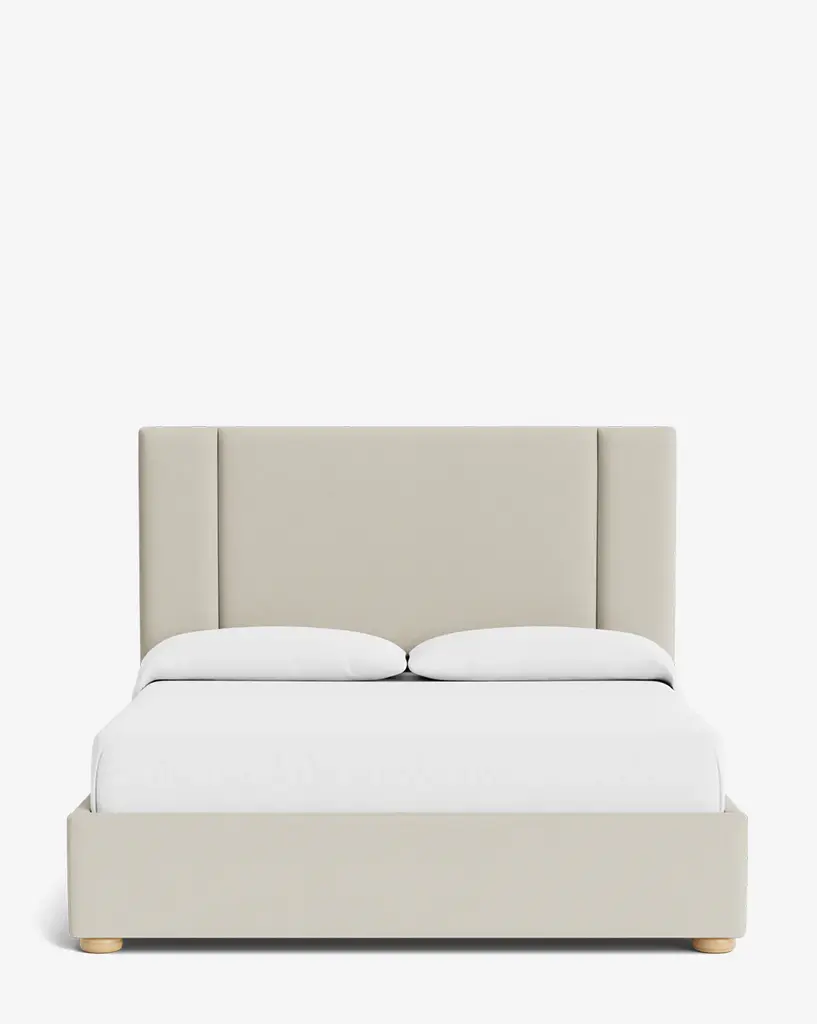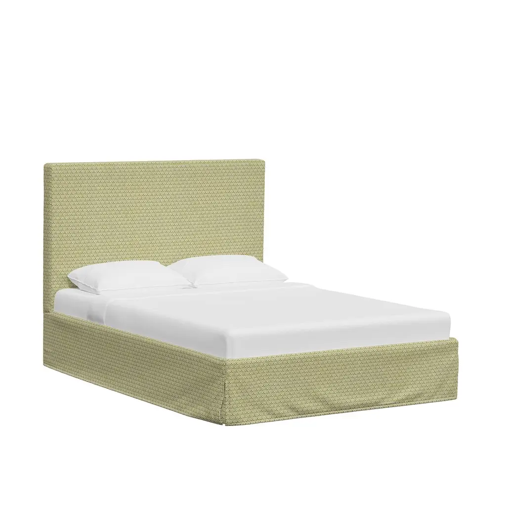 Indian block prints inspired the upholstery's small-scale motif, which brings timeless elegance to this bed's clean, minimalist lines. Made in the USA, the bed has a long tailored skirt and a high padded headboard ideal for resting against when reading or watching TV.