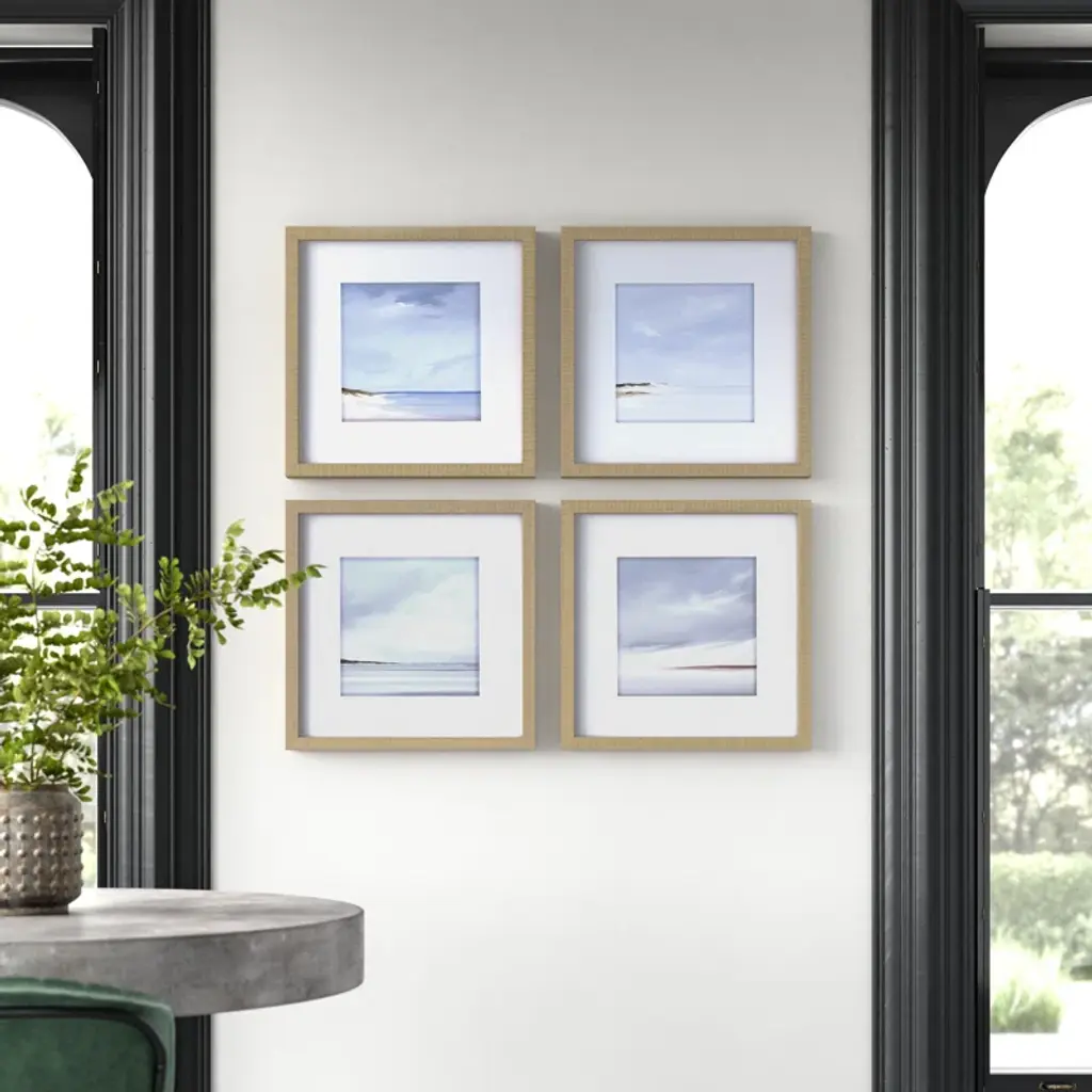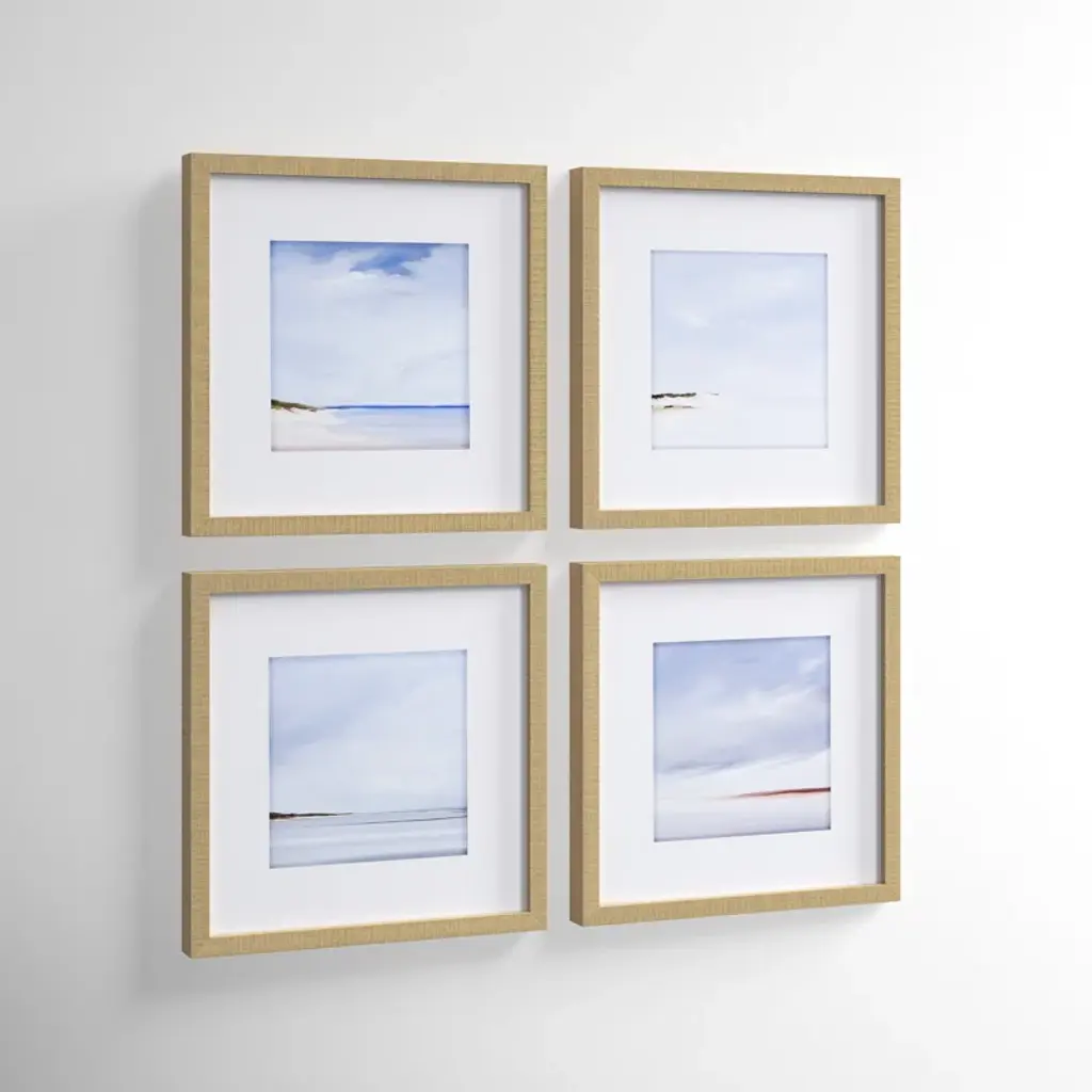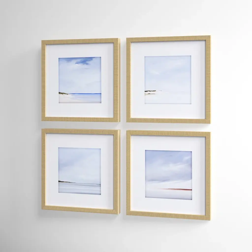 This 4-piece set of prints lets you enjoy the calm of your favorite beach getaway without ever leaving your home. Made in the USA, this set includes four different blue and white coastal giclee prints on fine art paper — all raised and matted. To really make the center shoreline pop, each print is framed with a ribbed gold-finished molding to artfully contrast the soft hues within. Make it yours: You can hang this set altogether to create an instant gallery wall, or space them throughout your space to add a cool-casual look throughout your room.
