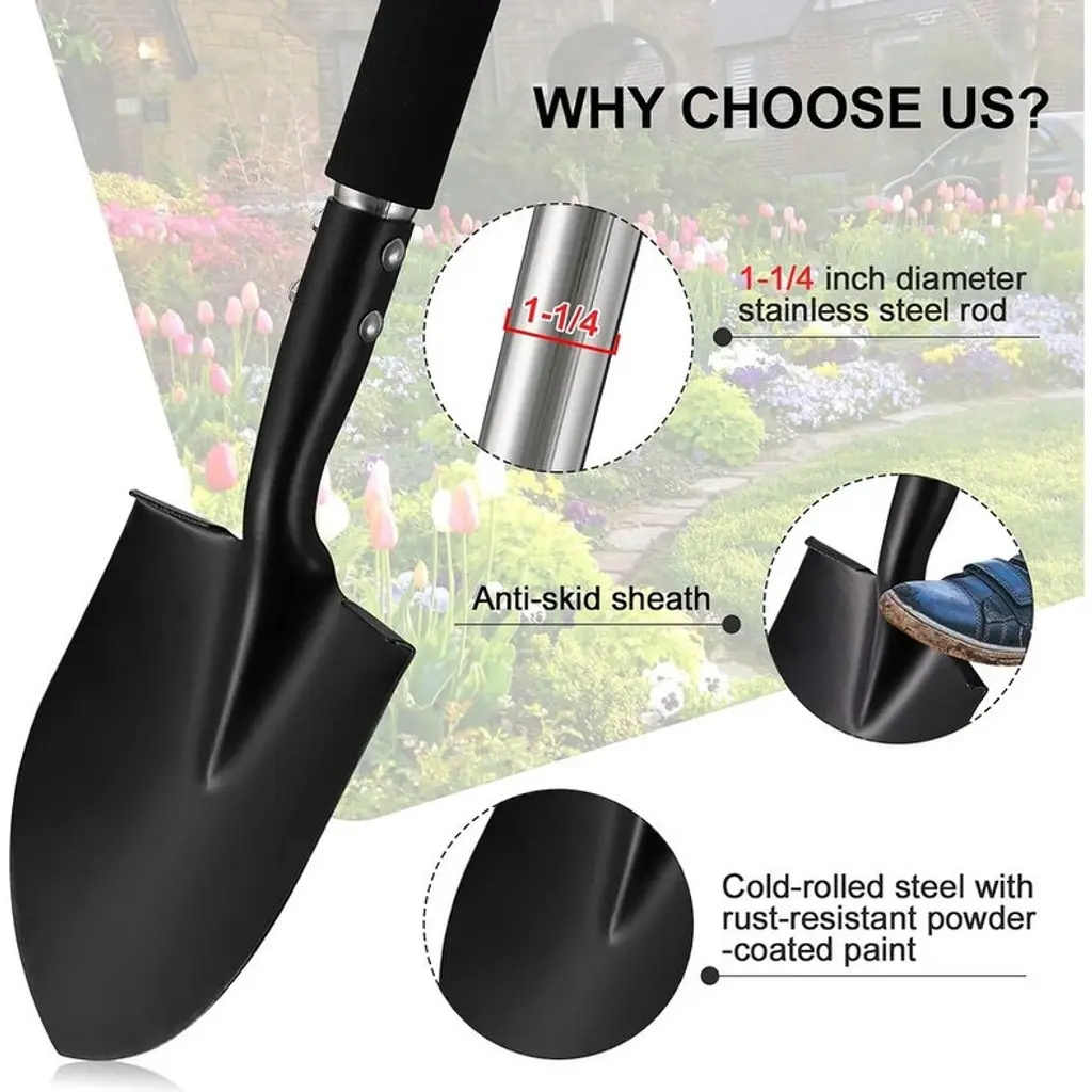 Well-designed:The shovel for car is an excellent tool for digging in small spaces, with a D-shaped curved handle design and a non-slip sheath. Great for camping, small area work, garden boxes, light use, and children's use. STURDY:The metal shovel pole is designed with a 1-1/4inch diameter stainless steel rod, and the heavy duty shovel head is made of cold-rolled steel with rust-resistant powder-coated paint. Strong and durable, it can adapt to various jobs. Widely used:The overall size of the small shovels for digging is only 31 inches, which can be used as a garden trowel, garden spade,beach shovel, camping shovel, car shovel,digging shovel, and children's snow shovel. Easy to store and carry:With a detachable design, it can be quickly disassembled for storage, and can also be stored in a car, backpack or garage.