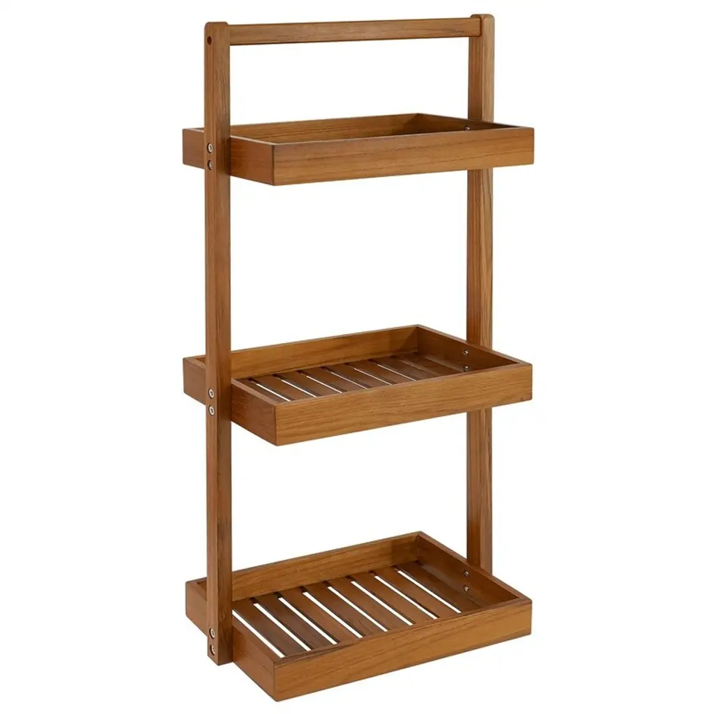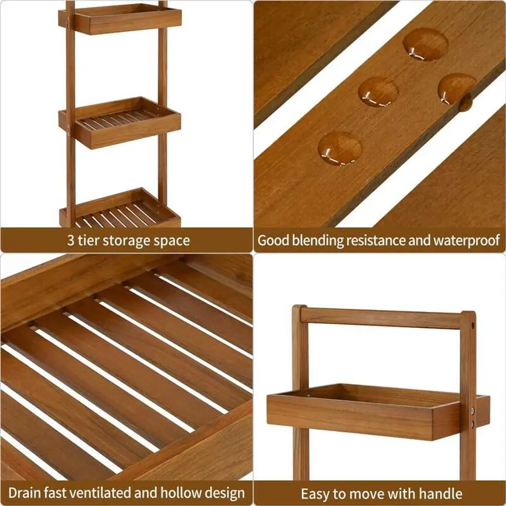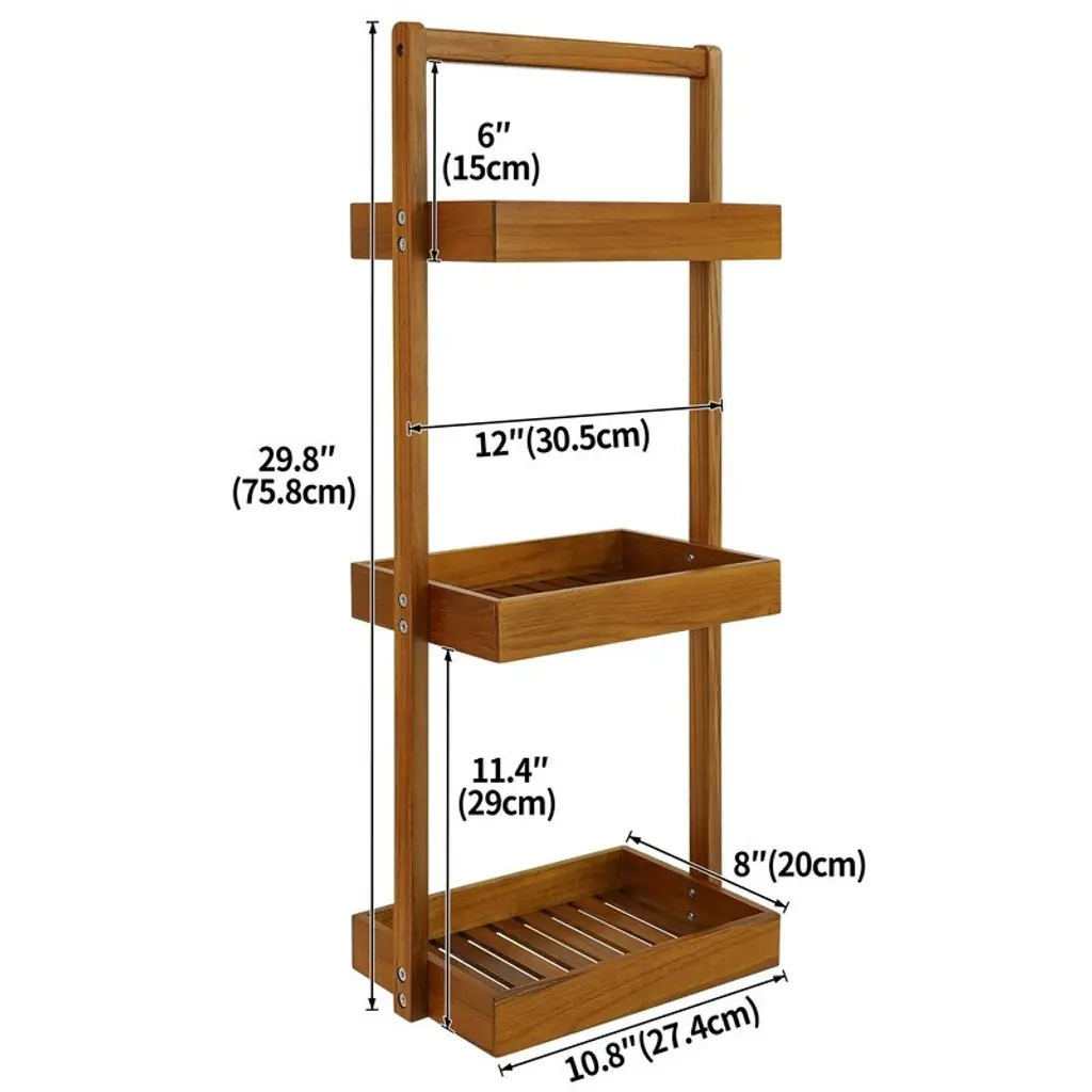 Teak Wood Compact Design: 3 Tier bathroom shower caddy measures H29.8" x L12" x W10" (H75.8 x L30.5x W25.4cm), the bottom floor of the shower caddies has been upgraded, the width is 2 inches wider than before, enlarged and more stable than the original. 3 tier shelves stacked in a compact vertical format to ample space to store all your toiletries in one convenient location. Say goodbye to cluttered bathroom and hello to a more organized and beautiful bathroom with our 3-tier shower caddy. Multi-Purpose: The drain fast ventilated and hollow design of the shower rack, this is a great place for your shampoo; store towels, hand lotion, bath salts, toilet paper and bar soap, you can arrange your shower essentials neatly and elegantly for easy access anytime. Solutions for Corners: Use the shower shelf organizer to hold bath accessories, perfect for shower corner it will not take up too much space, also fit to storage fruits, and vegetables in your kitchen. The teak wood shower caddy isn't just a functional product, it's also a stylish addition to any bathroom and complement your deco. Durable Material: The standing shower caddy made of grade A teak, color darkens as it ages. The longer, the more beautiful it will be. Teak wood hardness is higher than bamboo, so that the product is more solid, improve the bearing capacity, smooth surface is easy to clean care, long-term use can also keep new.