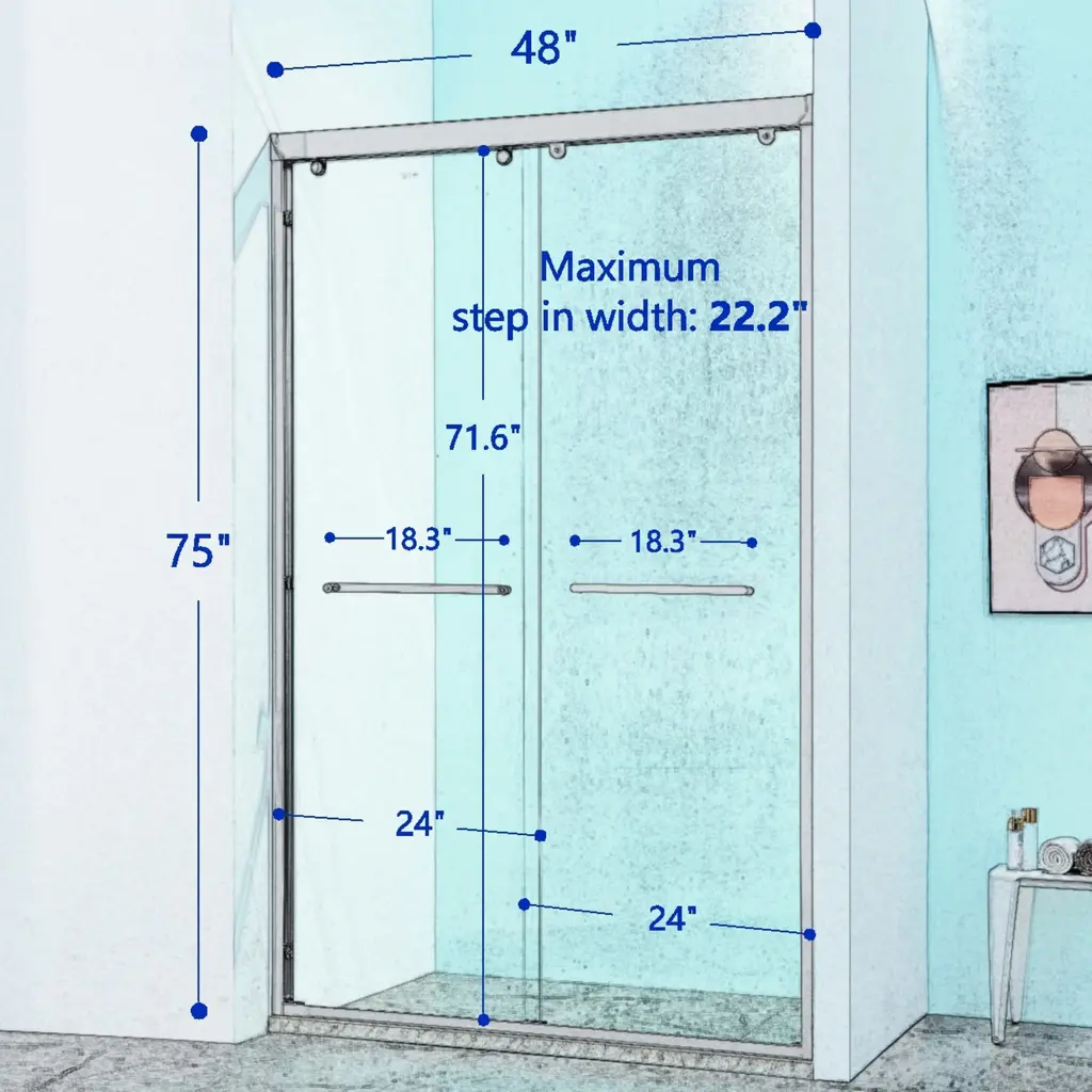 Product Features The shower or tub door offers a classic style with a modern touch. transform your bathroom with a beautiful balance of functionality, elegance, and sophistication. A variety of finishes and glass options will match any bathroom decor. Tempered glass, premium quality aluminum or stainless steel frame, accessories included. Professional installation is recommended. Shower Base not included, need to purchase separately. This sliding shower door specific size is 48 in wide x 76 in height. Quality 3/8 in. (8mm) thick Clear certified tempered glass; Reversible for a right or left door opening to fit your specific layout. Stainless steel shower door pull Handle features high hardness, corrosion and rust resistance, strong and durable properties ensure long service life. Up to 1 in. adjustment per side for out-of-plumb (uneven) walls within wall profiles. Aluminum rail profile with SS304 covered Spare parts: wheels, anti-jumping knob, handles, wall bracket, guide block in SS304 Hardware Finish: Matte Black Pictured shower base is not included (purchase separately) IMPORTANT! All measurements should be taken only AFTER walls are finished (tile, back walls, etc.); Professional installation recommended.