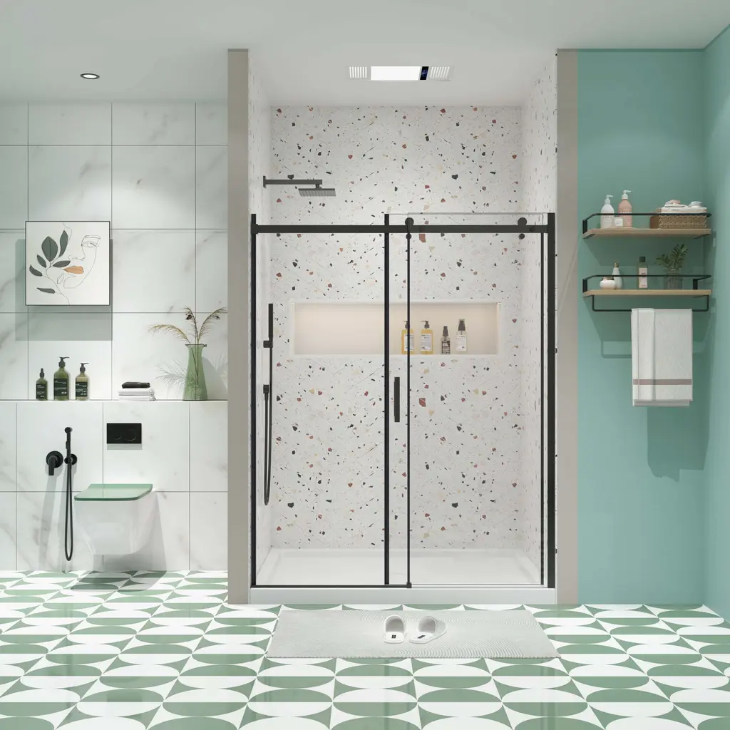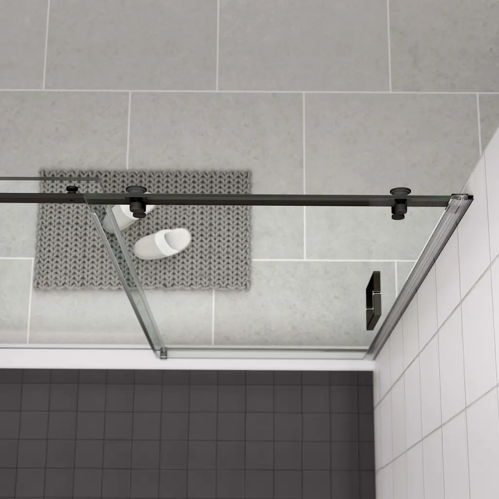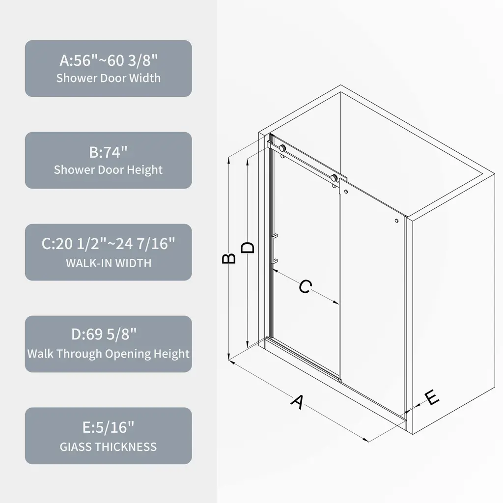 【Product Features】 ★Alu top track with high quality #304 stainless steel hardware, with 36000 times open and close test. ★SGCC 5/16" tempered clear glass with Nano eacy clean treatment, cleaning become easy. ★Smooth and comfortable sliding system ★Good anti-leakage function. ★Adjuatable wall channel for uneven wall problem. 【Description】 [Sliding shower door Left or Right opening] W: 56"-60" H: 74" 5/16" tempered glass Stainless steel handle 8" Easy install system Each clean up glass treatment Roller with 36000 times open and close test. 【This product is fragile, if there is any damage when you receive the goods, please take a photo and contact us, so that we can quickly verify and deal with you】 【Notes】 1.Size Notice:Manual measurement has been used, there may be some reasonable errort, thanks for your understanding. 2.Color Notice:Due to factors such as display equipment and shooting environment, the color of the item may be slightly different from the picture, which is a normal phenomenon, please refer to the actual item 3.Assembly Notice:Please read assemble manual in advance. Please do not over-tighten nuts, as this may cause distortion or breakage. 4.It is recommended to put a layer of foam or soft cushion on the floor when installing to avoid scratching the floor. 5.If the item has any defects, damage or missing parts, please contact us with pictures or videos so that we can understand your needs and help you quickly, and always remember to retain its original packaging to ensure any return requests. We will try our best to solve any problems you may have. 6.If you receive the wrong product, please attach the product picture, the infographic of the outer package and the picture containing SKUs, so that we can verify and quickly deal with it for you