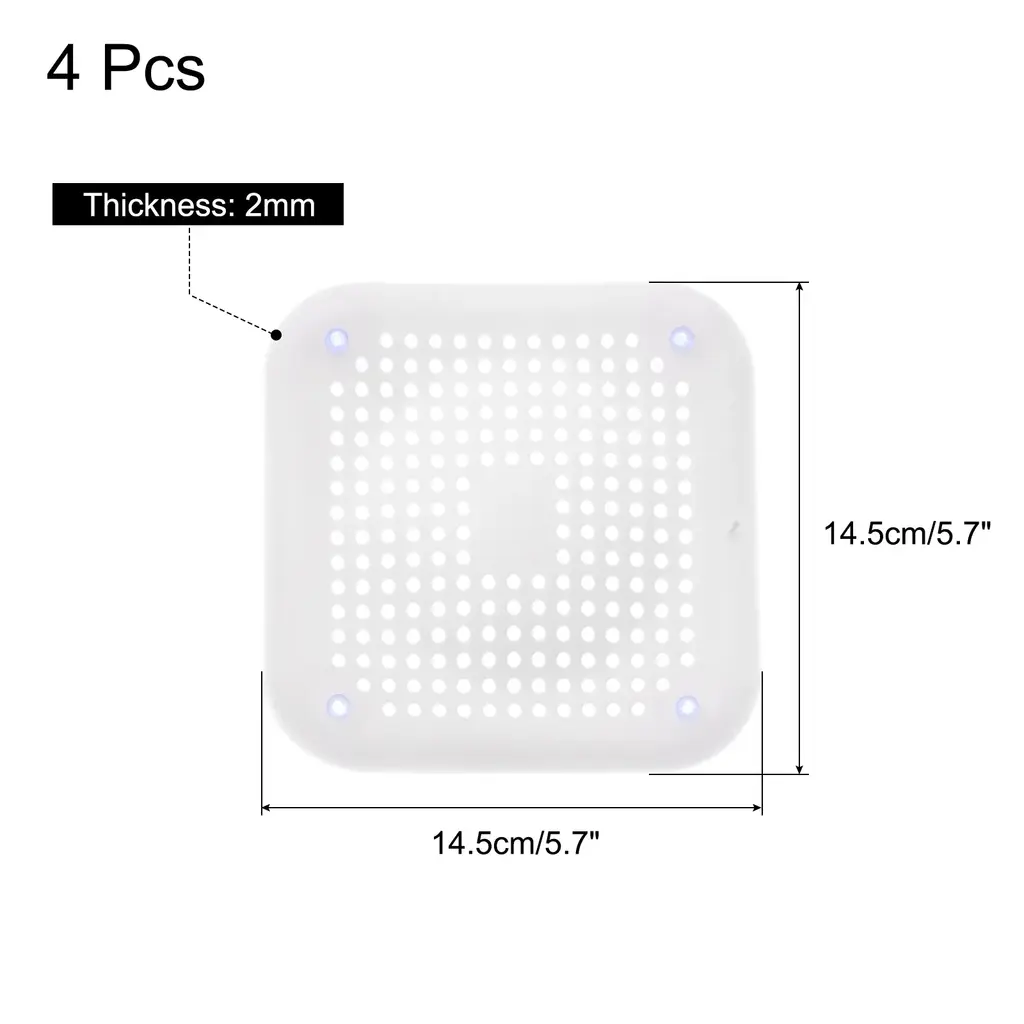 Description:1. The shower drain hair catcher is made of soft silicone material, which is non-slip, durable, and flexible, has good elasticity and wear resistance, and can be used for a long time.1.7. The drain hair catcher is equipped with integrated strong suction cups, its suction cups are not easy to separate from the drain cover and efficiently catch hair and debris, preventing clogs in your shower, kitchen, or bathroom tub, and can be easily removed for cleaning.3. Simply place the drain cover over the drain opening and press down to create a tight seal. Lift a corner of the silicone shower drain first when you want to remove and clean, regularly to maintain optimal performance.4. This drain cover can be used in showers, kitchen sinks, bathroom tubs, or any other drain where hair and debris may accumulate.5. Requires the hair drain to be flat with no raised obstructions. Otherwise, it can't be suctioned out.Specification:Material: SiliconeColor: WhiteLength: 14.5cm/5.7"Width: 14.5cm/5.7"Thickness: 1.7mmPackage Included: 3pcs x shower drain hair catcher