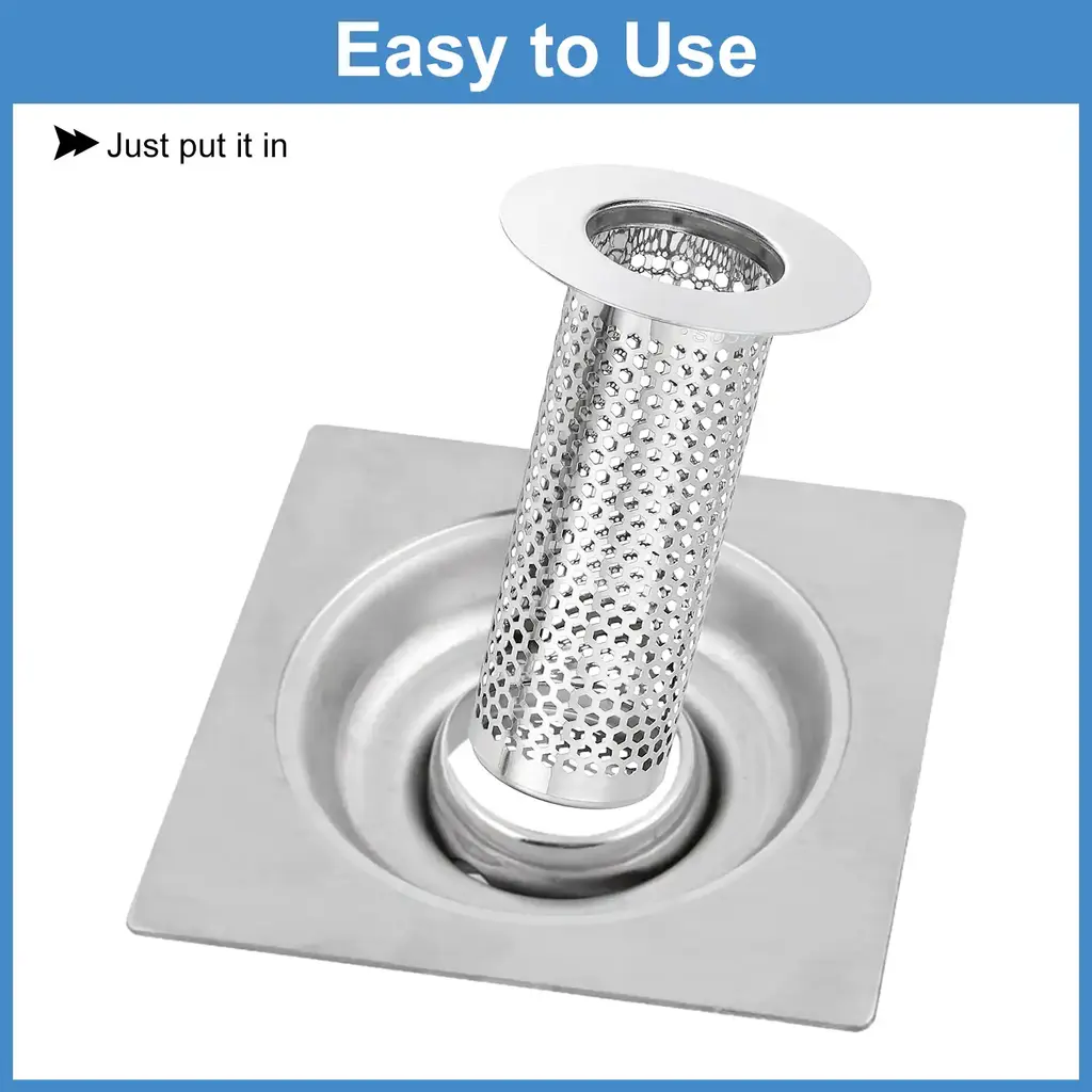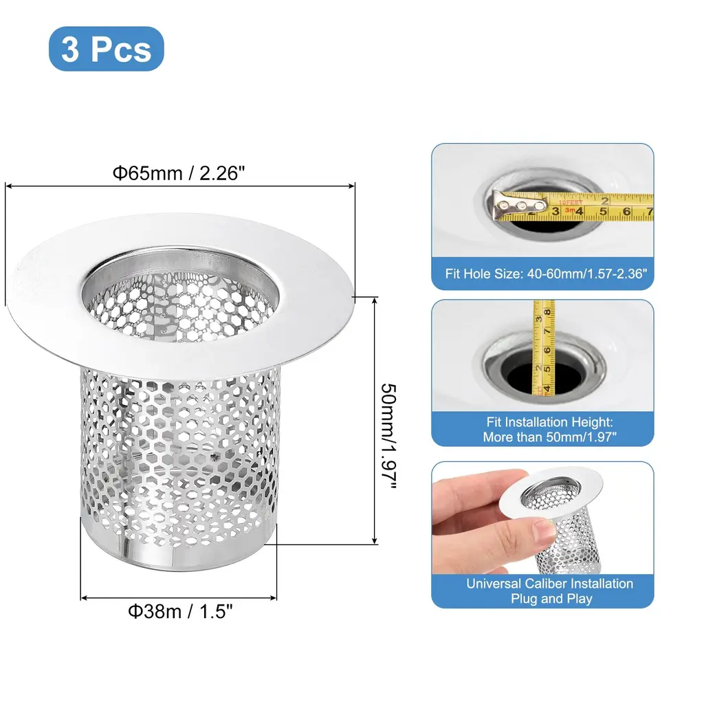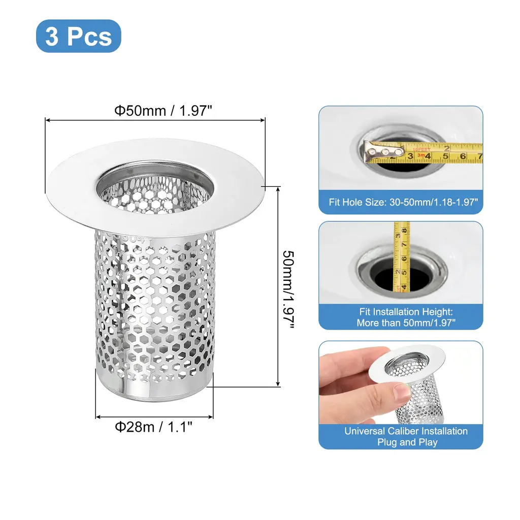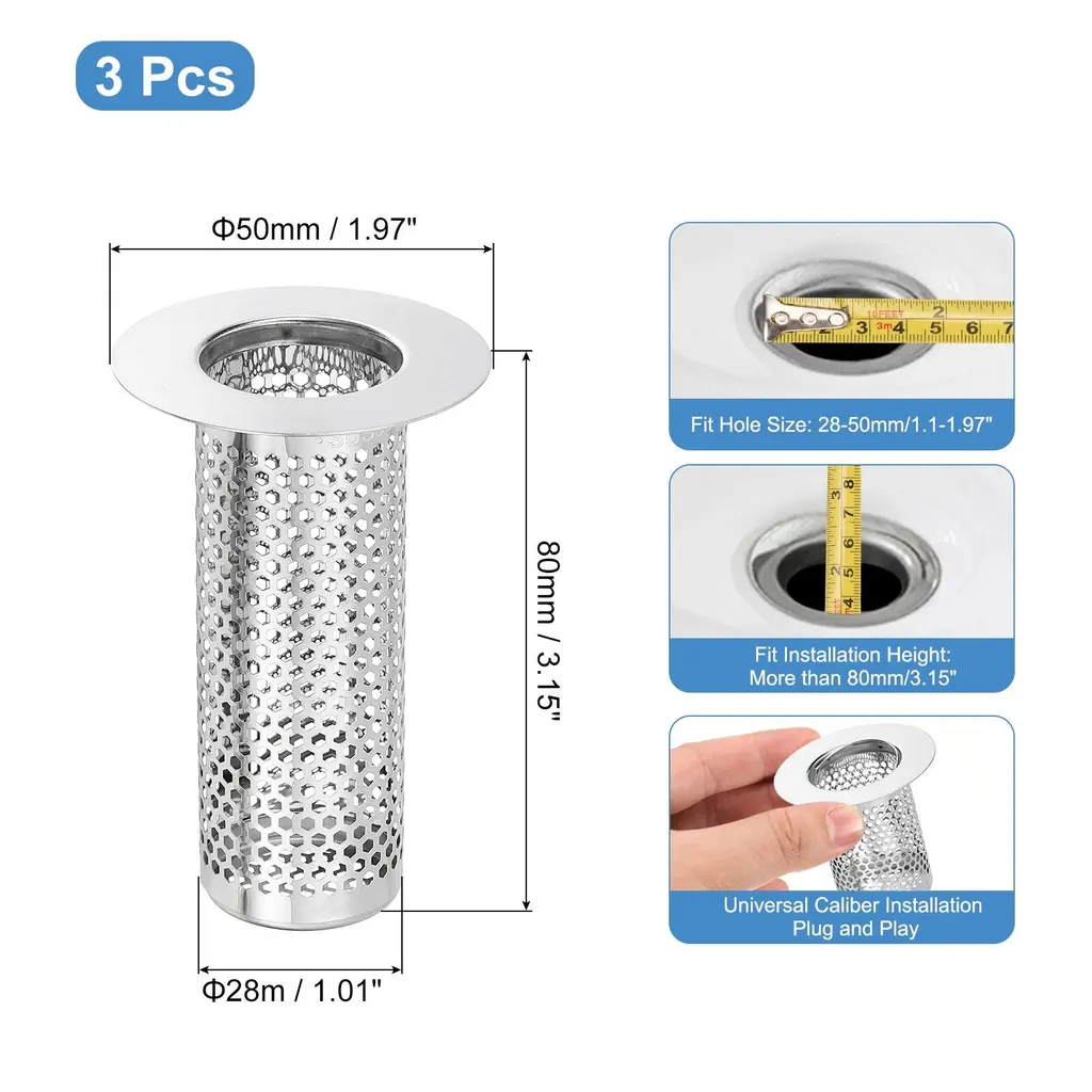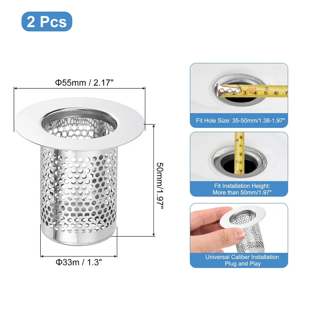 Description[Material] - The shower drain strainer is made of 304 stainless steel, it is easy to rust and deform, with high wear resistance and long-lasting durability. The outer edge is moderately thick and durable, allowing the bathroom drain filter to stay securely on the drain pipe.[Filter Holes & Anti Clogging] - Its filter holes are dense and even, preventing kitchen waste and large foreign matter from clogging the sewer ensuring smooth drainage and improving drainage efficiency.[Easy to Use & Clean] - The stainless steel floor drain strainer is easy to install, just place it directly over the drain hole. It can be easily removed, poured out debris, and cleaned with soap to restore the surface luster.[Wide Application] - The bathroom drain cover has a very good filtering effect, effectively prevents hair and tiny debris from entering the sewer, and can be well adapted to the drain outlet. It can be widely used in floor drain outlets in kitchens, bathrooms, balconies, etc.SpecificationMaterial: 304 Stainless SteelOverall Size: 80 x 50mm/3.15 x 1.97inch(H*OD)Bottom Basket Diameter: 28mm/1.1inchFit Hole Size: 30-50mm/1.18-1.97inchFit Installation Height: More than 80mm/3.15inchPackage Listing2 x Shower Drain Strainer