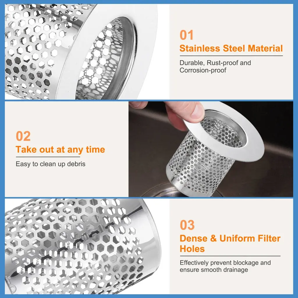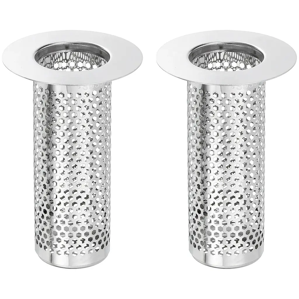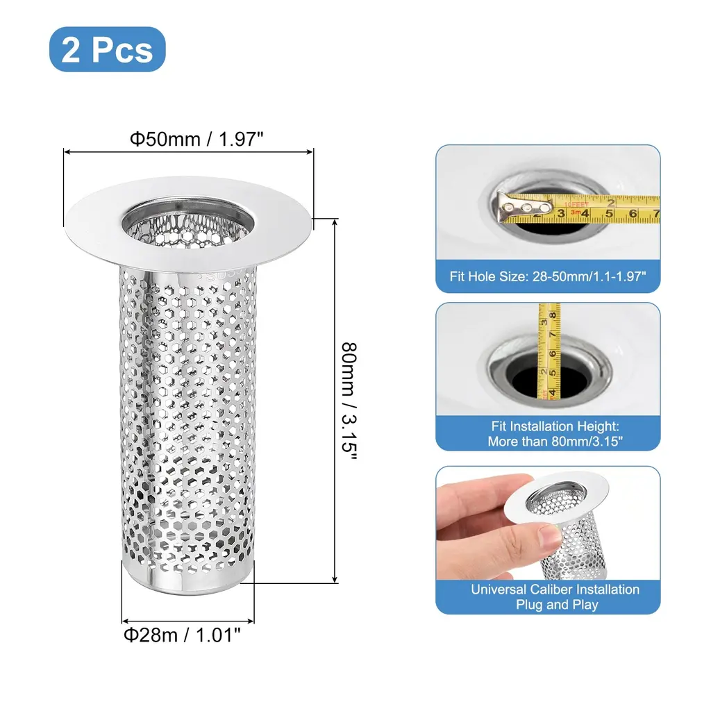 Description[Material] - The shower drain strainer is made of 304 stainless steel, it is easy to rust and deform, with high wear resistance and long-lasting durability. The outer edge is moderately thick and durable, allowing the bathroom drain filter to stay securely on the drain pipe.[Filter Holes & Anti Clogging] - Its filter holes are dense and even, preventing kitchen waste and large foreign matter from clogging the sewer ensuring smooth drainage and improving drainage efficiency.[Easy to Use & Clean] - The stainless steel floor drain strainer is easy to install, just place it directly over the drain hole. It can be easily removed, poured out debris, and cleaned with soap to restore the surface luster.[Wide Application] - The bathroom drain cover has a very good filtering effect, effectively prevents hair and tiny debris from entering the sewer, and can be well adapted to the drain outlet. It can be widely used in floor drain outlets in kitchens, bathrooms, balconies, etc.SpecificationMaterial: 304 Stainless SteelOverall Size: 80 x 50mm/3.15 x 1.97inch(H*OD)Bottom Basket Diameter: 28mm/1.1inchFit Hole Size: 30-50mm/1.18-1.97inchFit Installation Height: More than 80mm/3.15inchPackage Listing2 x Shower Drain Strainer