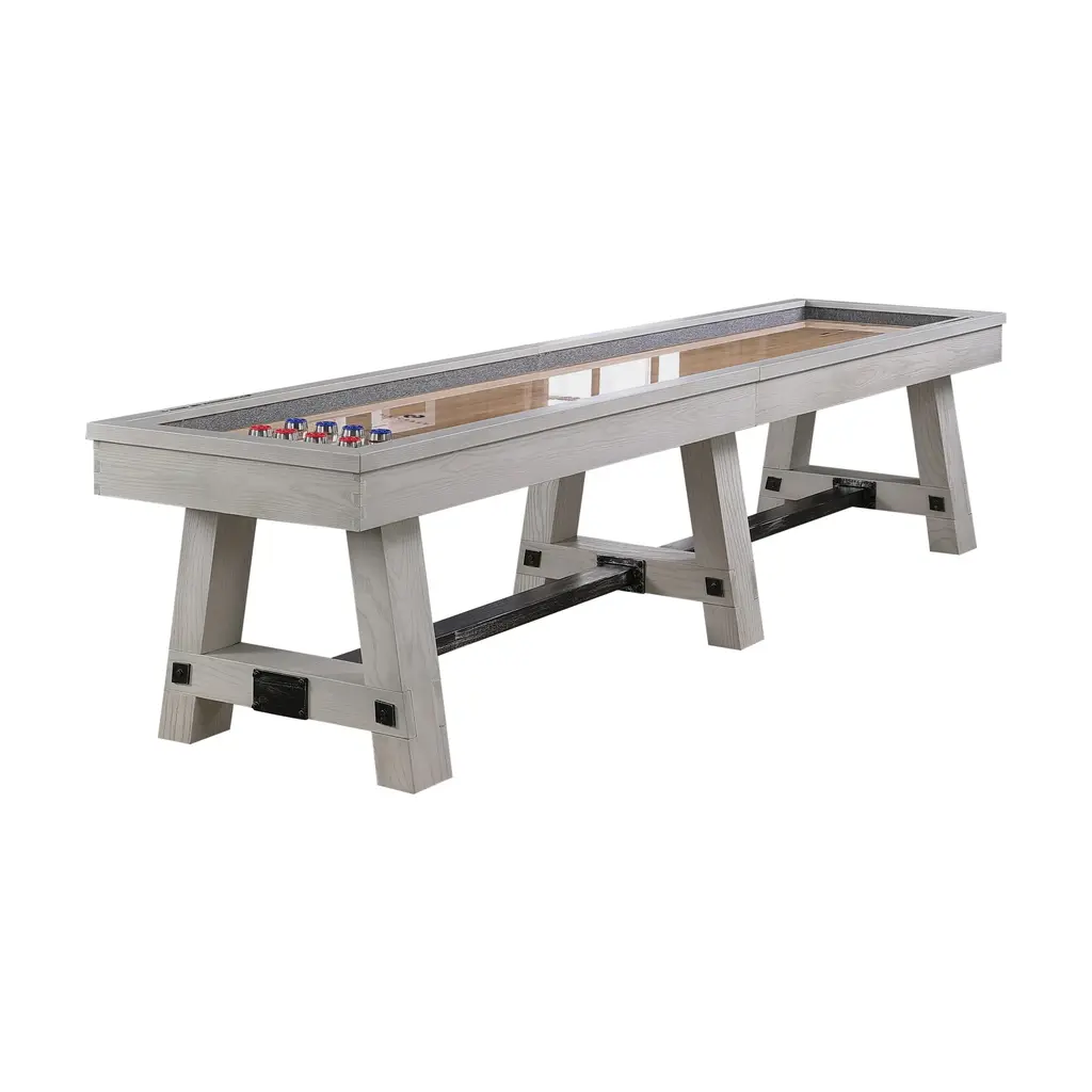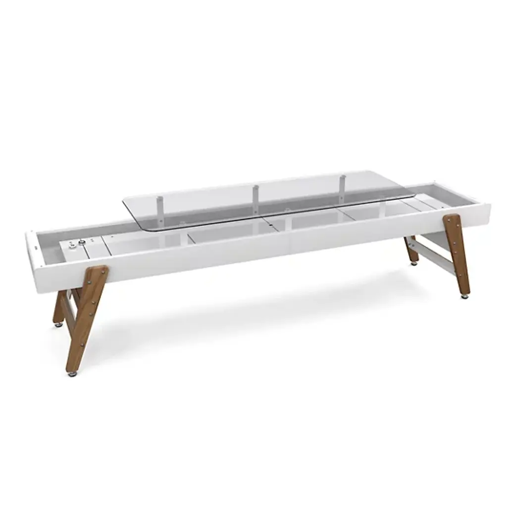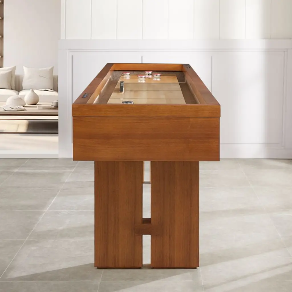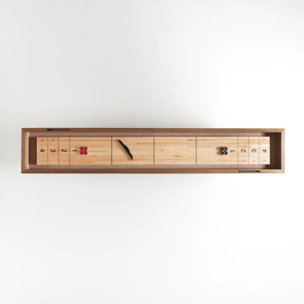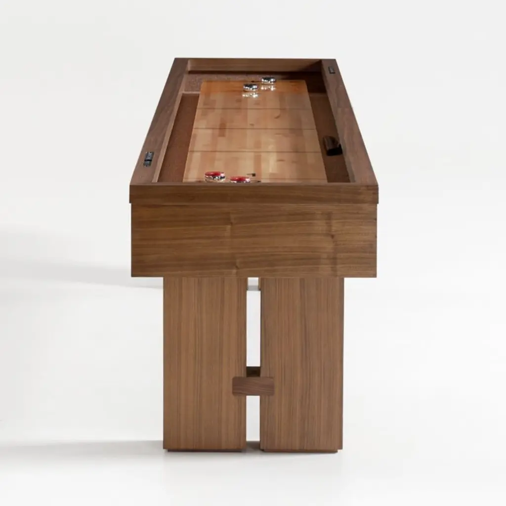 A tavern classic comes home. Faced in gorgeously grained walnut veneer, our decor-friendly shuffleboard table gives the centuries-old game a fresh look. The clean lines, crisp numerals and satiny poplar playing surface make the game table a stunning addition to the modern home, while the slender footprint fits easily into your game room, home bar or finished basement. Sturdily built with strong tongue-and-groove joints and climatic adjusters to ensure the playfield stays level, our exclusive shuffleboard table comes complete with pucks, shuffleboard powder, a table brush and a protective cover.