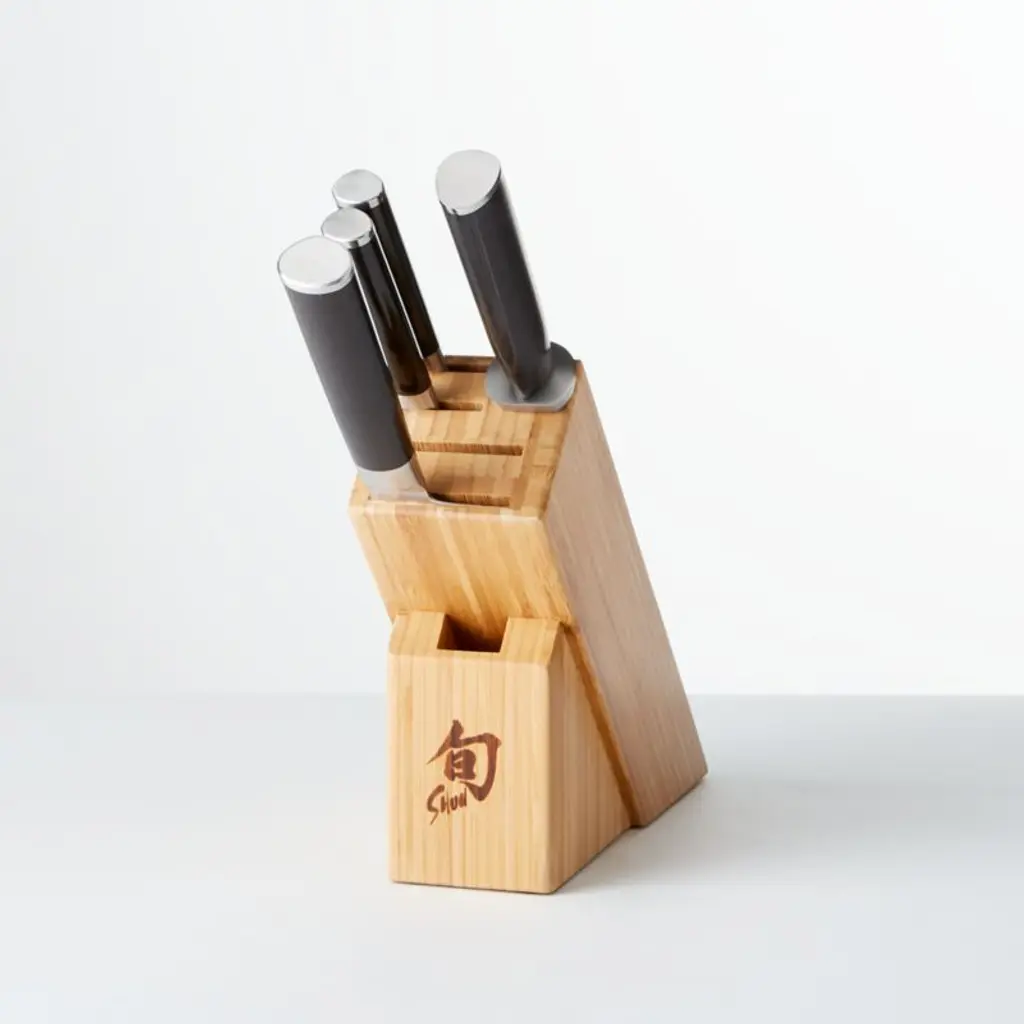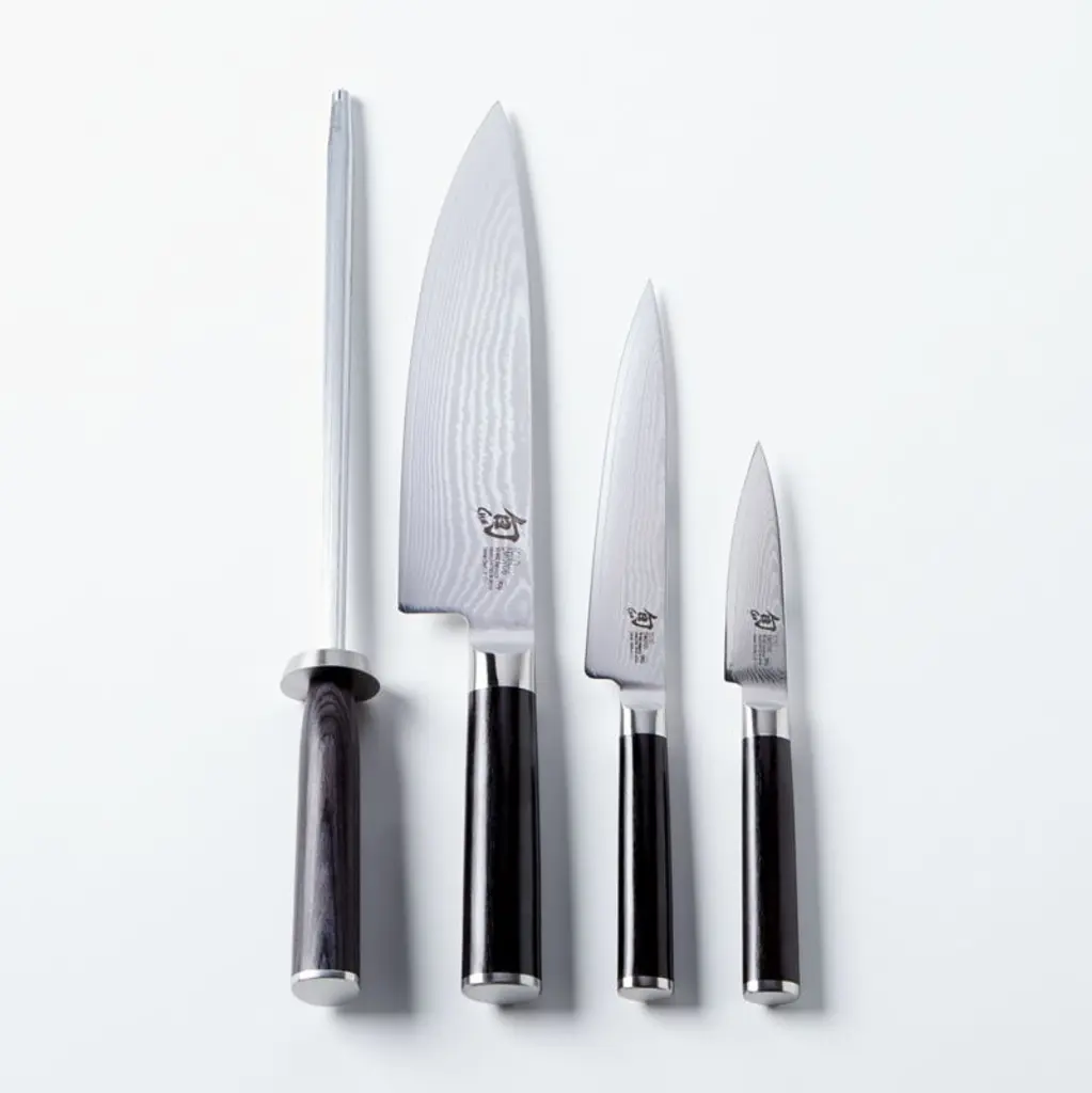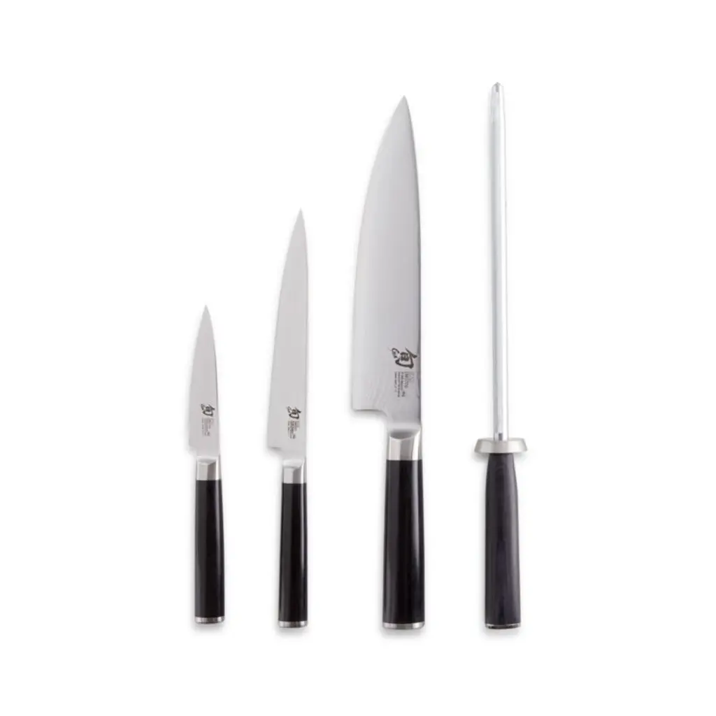 Start your knife collection off right with this classic set. Lightweight yet durable, the all-purpose chef's knife efficiently performs nearly any cutting task. The paring knife nimbly handles more detailed jobs such as peeling and trimming, while the utility knife is the perfect in-between size for in-between tasks. The knives pair steel blades with D-shaped PakkaWood ® handles of resin-impregnated birch. The honing steel's built-in angle guide takes the guesswork out of sharpening, and the two honing surfacessmooth for everyday use, micro-ribbed for weekly caremaintain prized knives beautifully. Sleek ebony-hued handles contrast with the stainless steel tools.A slim bamboo block holds the pair, with room left over for a pair of shears and one more knife. Created in Japan by highly skilled artisans, the set includes 8" chef's knife, 3.5" paring knife, 6" utility knife, combination honing steel and 6-slot bamboo slimline block.Each exquisite Shun knife is carefully crafted in a 100-step process inspired by ancient sword smiths. The amazing razor-sharp blades are created in Seki City, Japan's 700-year-old center for samurai swords. Need help choosing? Here's your essential guide to choosing the best knifeView all Shun products