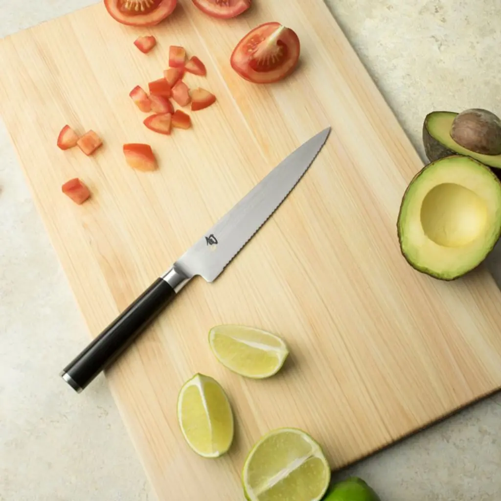 With its razor-sharp serrated blade, this serrated utility knife effortlessly cuts sausages, avocados and hard cheeses. The narrow, medium-sized blade makes the knife a nimble and precise tool for a variety of prep tasks. A "ripple" Damascus rust-free finish is achieved by forging 34 layers of steel on each side. The flexible, stick-resistant blade is stamped, hand-ground to an exceptional 16-degree angle, then polished by hand.Each exquisite Shun knife is carefully crafted in a 100-step process inspired by ancient sword smiths. The amazing blades are created in Seki City, Japan's 700-year-old center for samurai swords. Need help choosing? Here's your essential guide to choosing the best knifeView all Shun products
