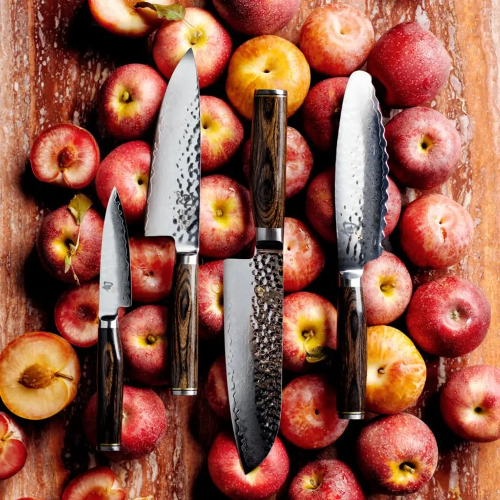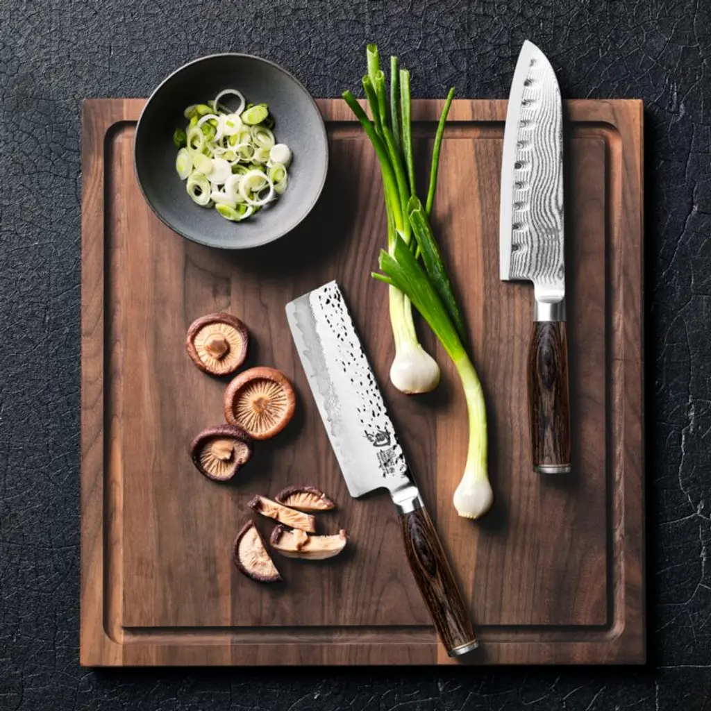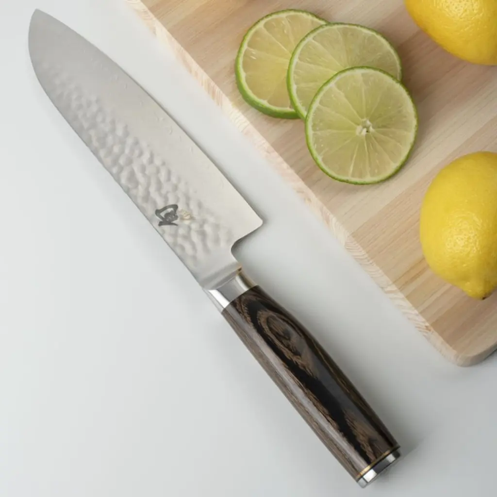 From the makers of Japan's finest cutlery comes this Premier collection with a unique new "tsuchime" finish. Hand-hammered texture creates cavities with an effect similar to hollow-ground, reducing drag for a gliding cut and quick release. Durable VG-MAX steel core is clad on either side with 34 layers of high-carbon stainless steel for maximum strength and stability. Oblong pakka wood handle nestles comfortably in the hand; stainless handle cap embossed with the Shun logo adds balance and beauty. These knives offer great edge retention and will never rust or corrode if properly maintained. The santoku Japanese chef's knife translates to "three great things": slicing, dicing and mincing.Each exquisite Shun knife is carefully crafted in a 100-step process inspired by ancient sword smiths. The amazing razor-sharp blades are created in Seki City, Japan's 700-year-old center for samurai swords. Need help choosing? Here's your essential guide to choosing the best knifeView all Shun productsShun sharpening services available; view program details (PDF format).