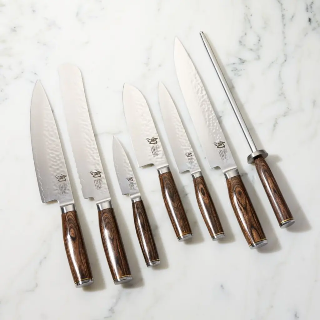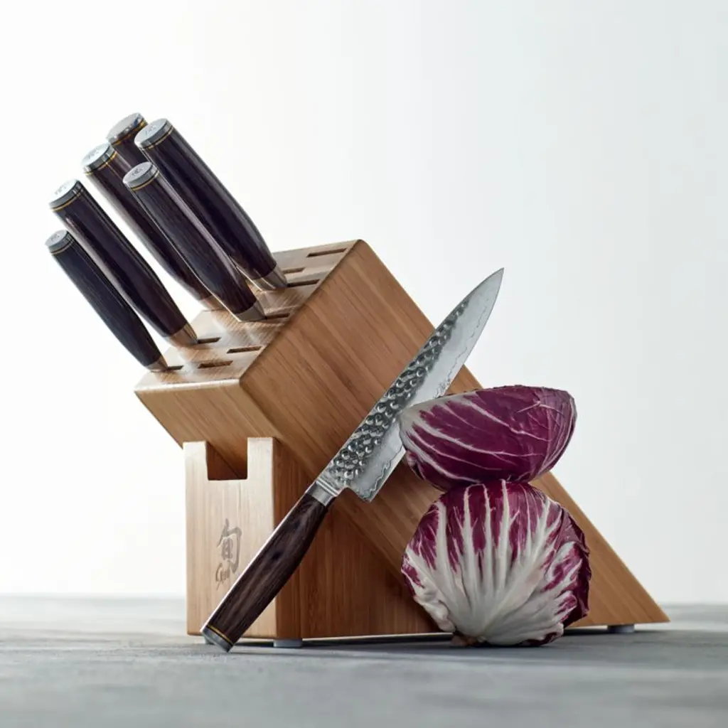 From the makers of Japan's finest cutlery comes the Premier collection with a unique new "tsuchime" finish. Hand-hammered texture creates depressions with an effect similar to hollow-ground, reducing drag for a gliding cut and quick release. Durable VG-MAX steel core is clad with 34 layers of stainless Damascus steel on each side for maximum strength and stability. This set of six essential kitchen knives and honing steel stores safely in a honey-hued bamboo block, which provides space for four additional pieces of cutlery. Set includes 4" paring knife, 5.5" santoku knife, 6.5" utility knife, 8" chef's knife, 9" bread knife, 9.5" slicing knife, honing steel and 11-slot block.Each exquisite Shun knife is carefully crafted in a 100-step process inspired by ancient sword smiths. The amazing razor-sharp blades are created in Seki City, Japan's 700-year-old center for samurai swords. Need help choosing? Here's your essential guide to choosing the best knife