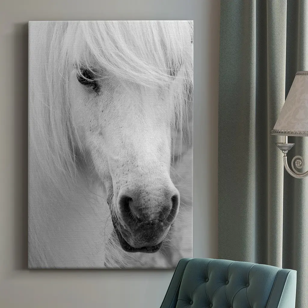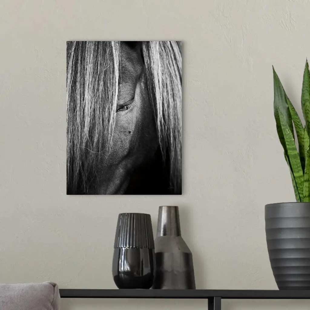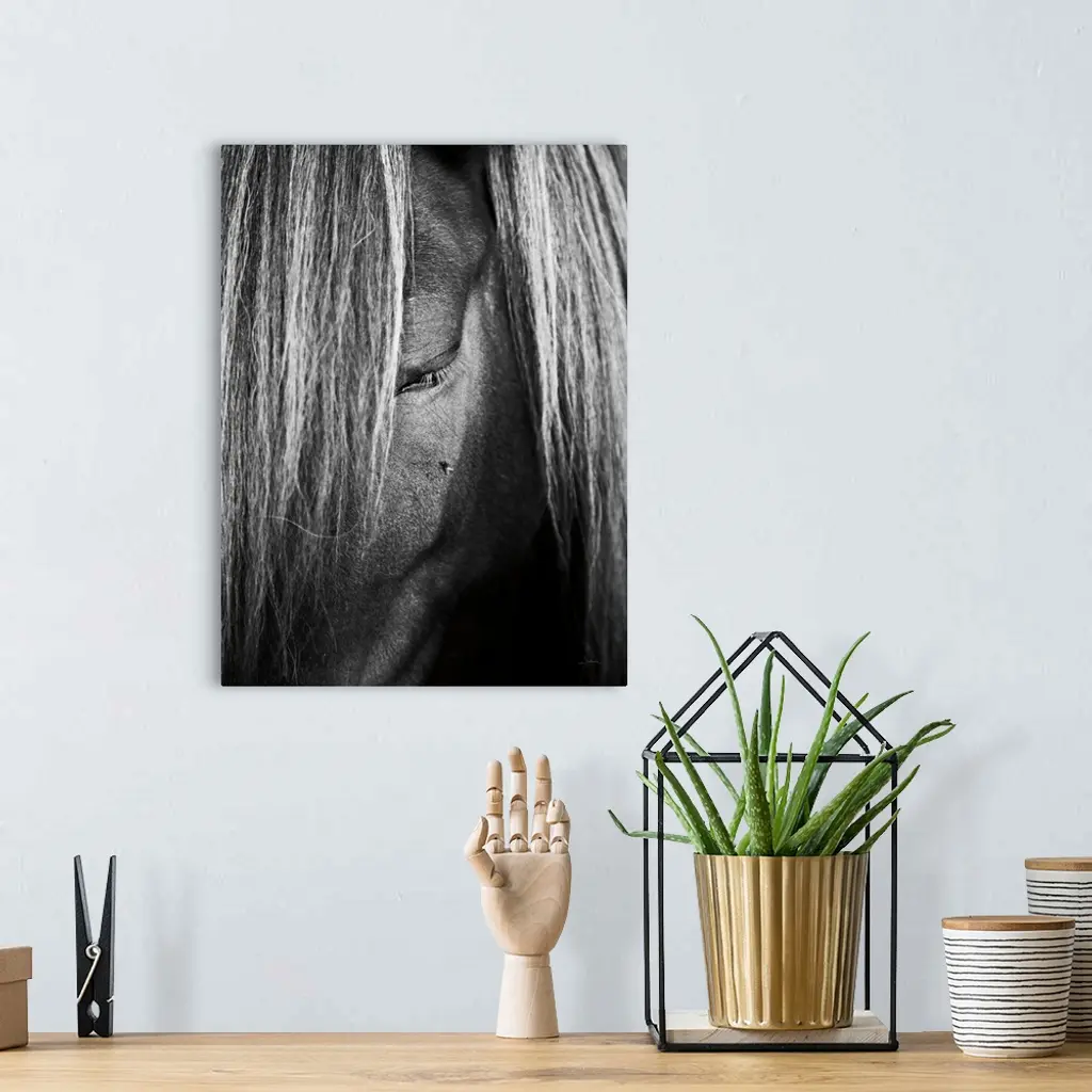Close up photo of a horse looking down with a fly resting underneath the eye.