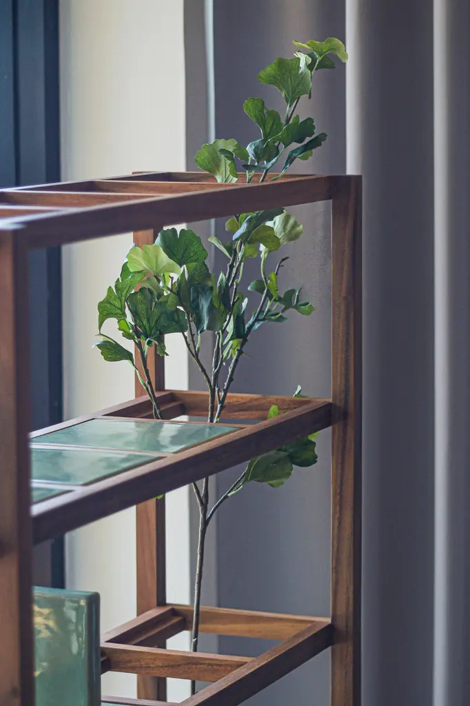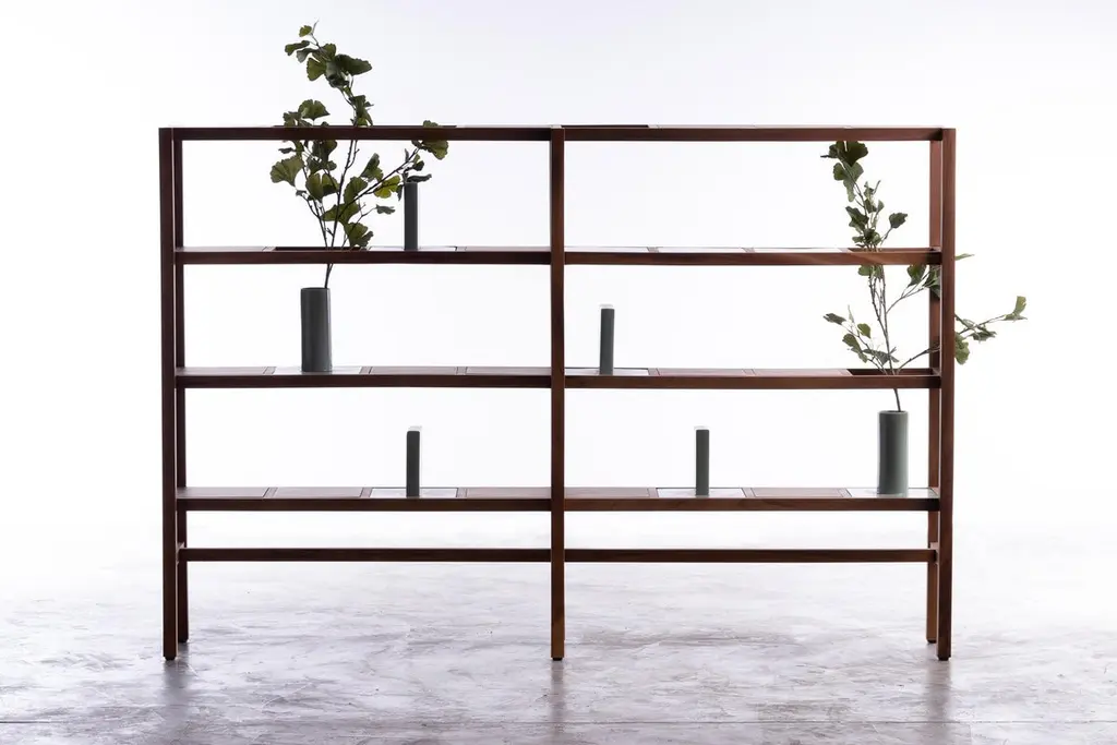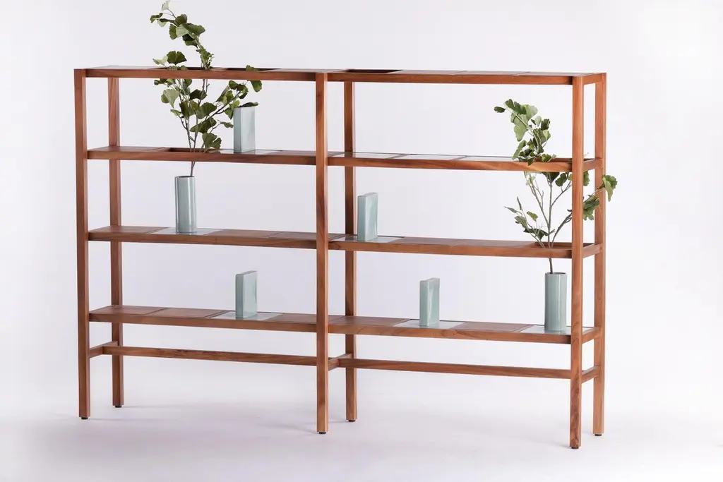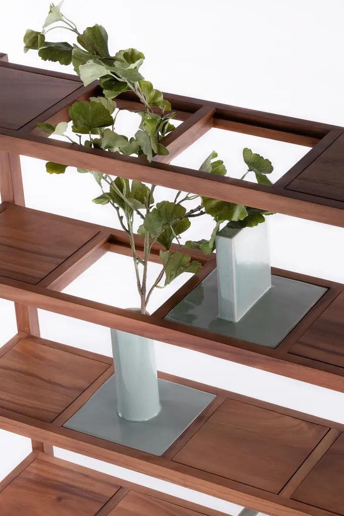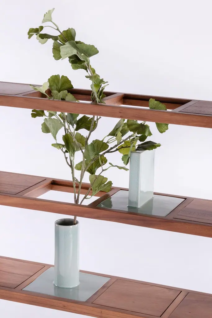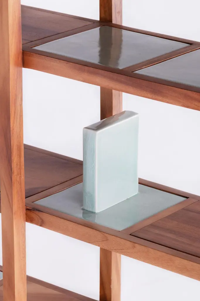 A collaborative work of two renowned local brands from Chiang Mai, Moonler and Siam Celadon. The Siam bookshelf fuses celadon, the highly praised local ceramic, with Chamchuri wood, resulting in a striking design.The Siam bookshelf is a new interpretation of a familiar marriage between ceramic objects and a bookshelf. It is an imprinted memory of ceramic pieces embedded into wood, turning an ordinary piece of furniture into an impressive decorative item. Celadon bookends and vases can be moved around to fit individual preferences.Moonler’s products are mainly made of Chamchuri Wood (known as Acacia or Monkey Pod) which are solid wood and solid wood is a living material. It may move according to different weather conditions and environment humidity. It is normal for wood to increase and decrease its own dimensions according to the climate. Variations of 1-2% on solid wood table tops or surfaces such as skin crack or movement caused by small differences in thickness between the various pieces of solid wood glued together to form the tabletop should be considered natural and typical of solid wood and cannot represent a reason for claims. Also, each and every wooden piece of furniture features unique color shades and grains. Natural crack or holes should be accepted as it is part of the charming of solid wood characteristic.