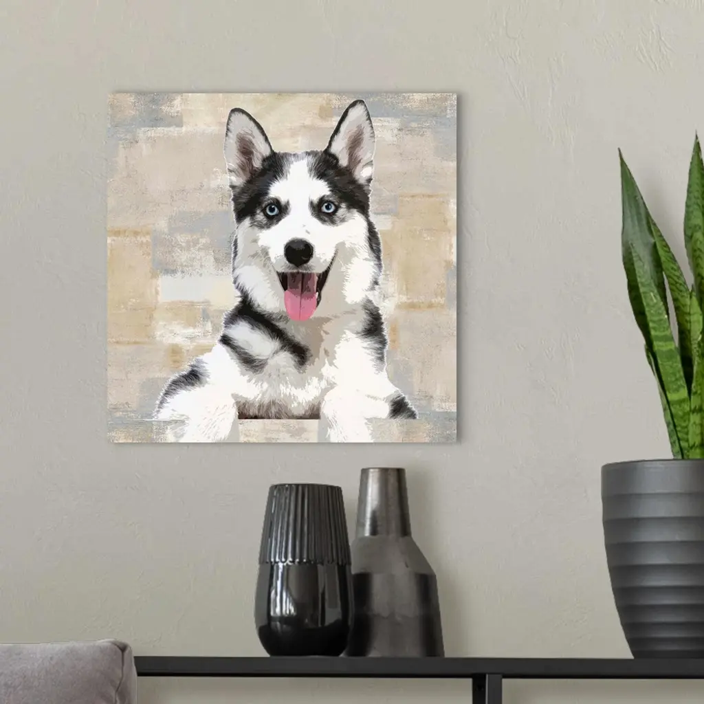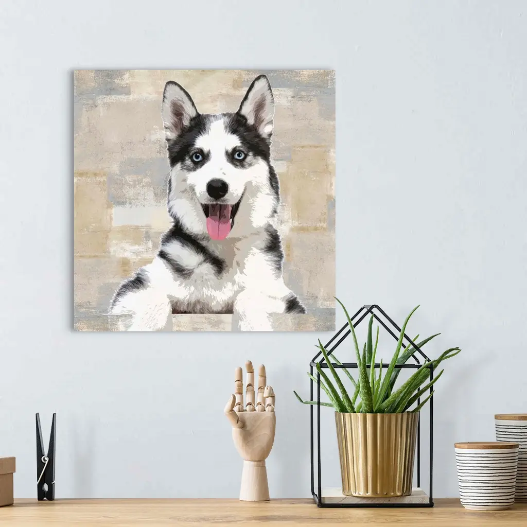 Square decor with a portrait of a Siberian Husky on a layered gray, blue, and tan background.