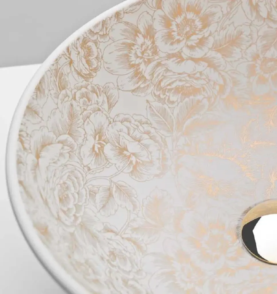 Simply posh with a valiant edge a Damascene. An artesanal technique with thousand year-old tradition which consists of applying fine gold threads to metal pieces to later wok the forms and reliefs. Ideal for spaces with a dual reading: minimalist and natural at first glance, and complex upon a second look.Measurement: 15.74" in D x 5.90" in HDetails: Porcelain and Metal Design and Manufactured in SpainThis item includes only the sink
