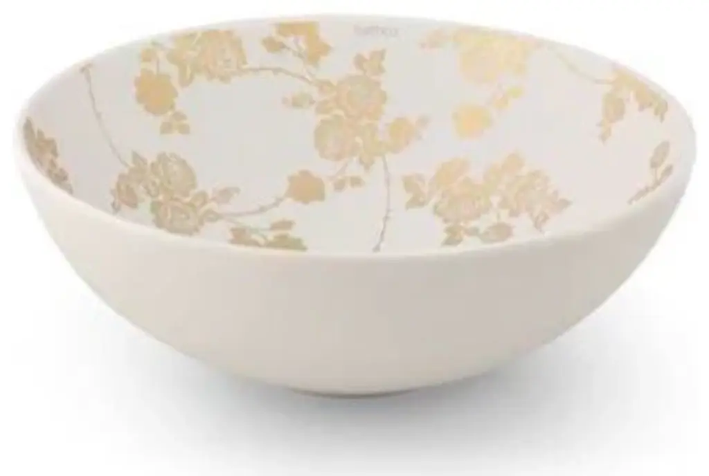 Simply posh with a valiant edge a Damascene. An artesanal technique with thousand year-old tradition which consists of applying fine gold threads to metal pieces to later wok the forms and reliefs. The Sicilia Natural Gold Flowers is 01 is ideal for spaces with a dual reading: minimalist and natural at first glance, and complex upon a second look.Measurement: 15.74" in D x 5.90" in HDetails: Porcelain and Metal Design and Manufactured in SpainThis item includes only the sink