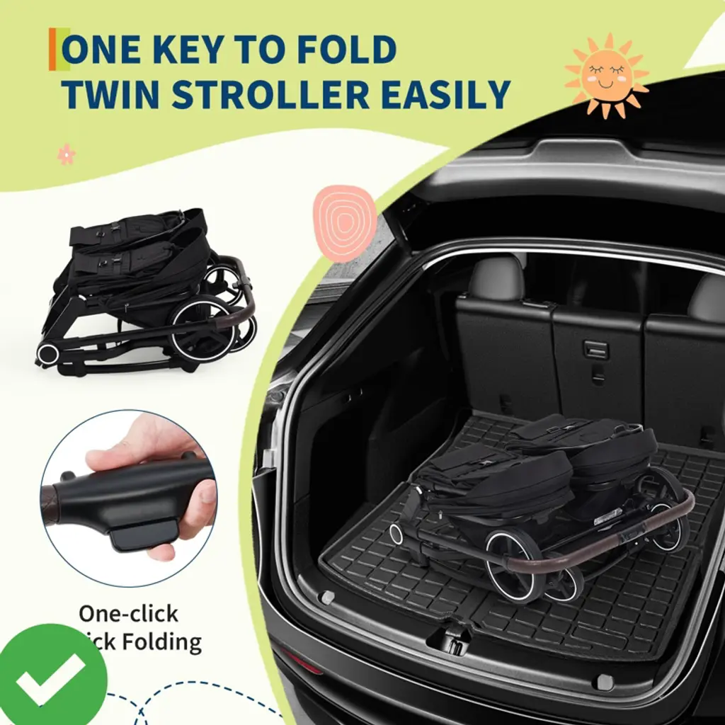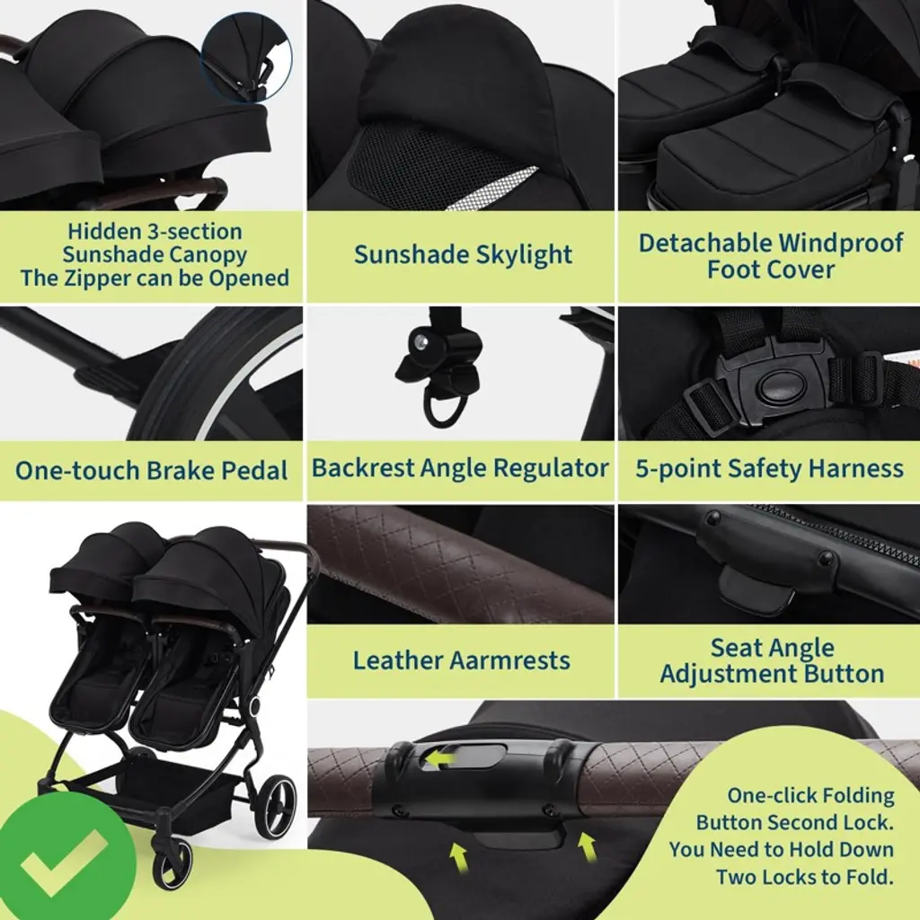 Designed for growing twins or siblings, this side-by-side stroller folds with a single button and secures automatically, slipping easily into the trunk or closet. Each seat reclines independently from upright to lie-flat, and the hidden three-panel canopy with peek-a-boo window teams with a detachable foot cover to shield little riders from sun, wind, or rain. A high landscape frame lifts children away from street exhaust, while five-point harnesses, leatherette armrests, a linked brake, and reversible seating options keep journeys comfortable for parents and kids alike.