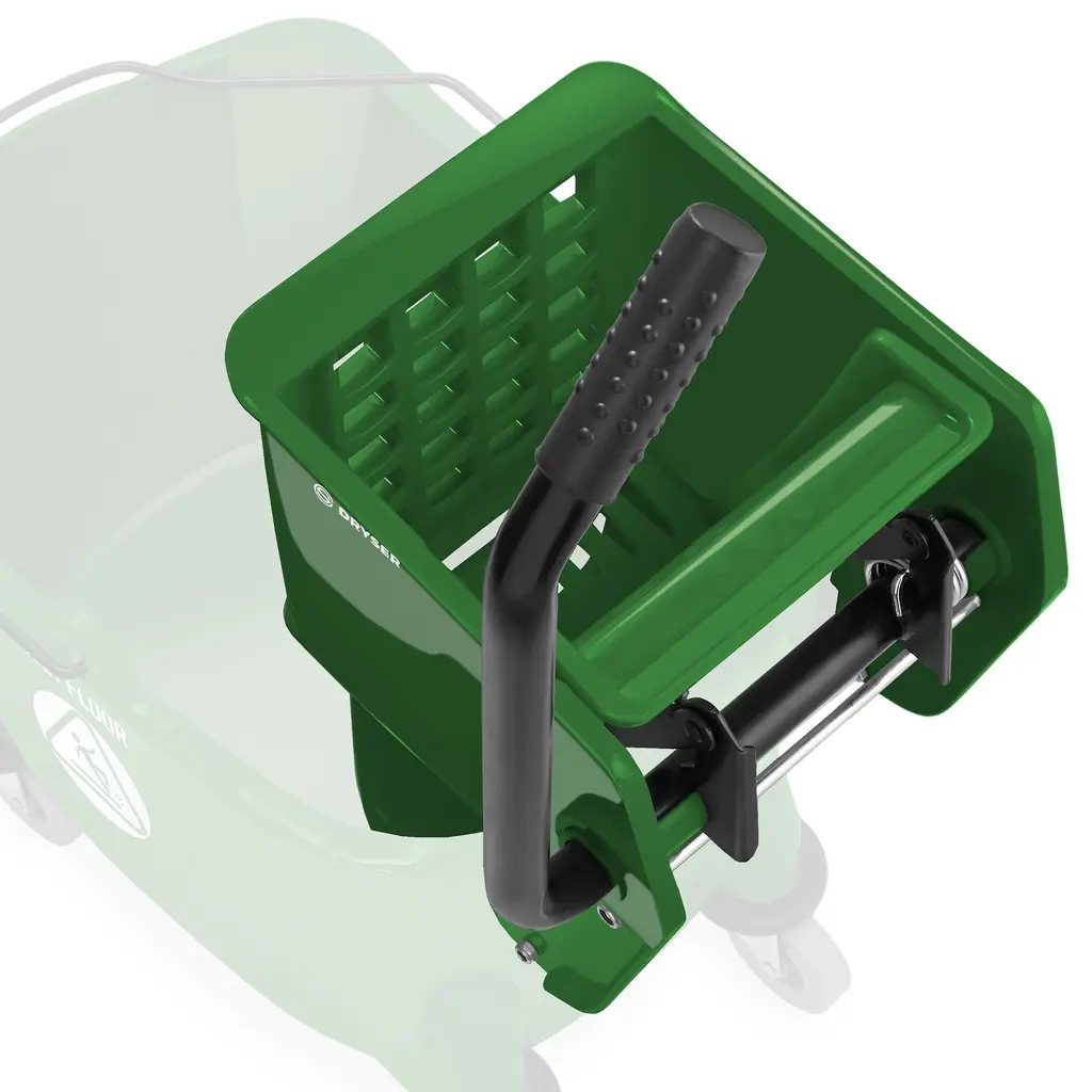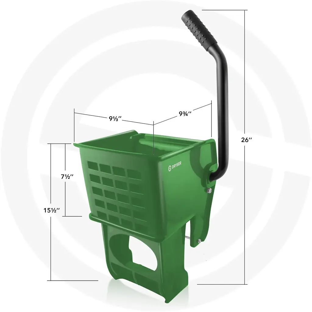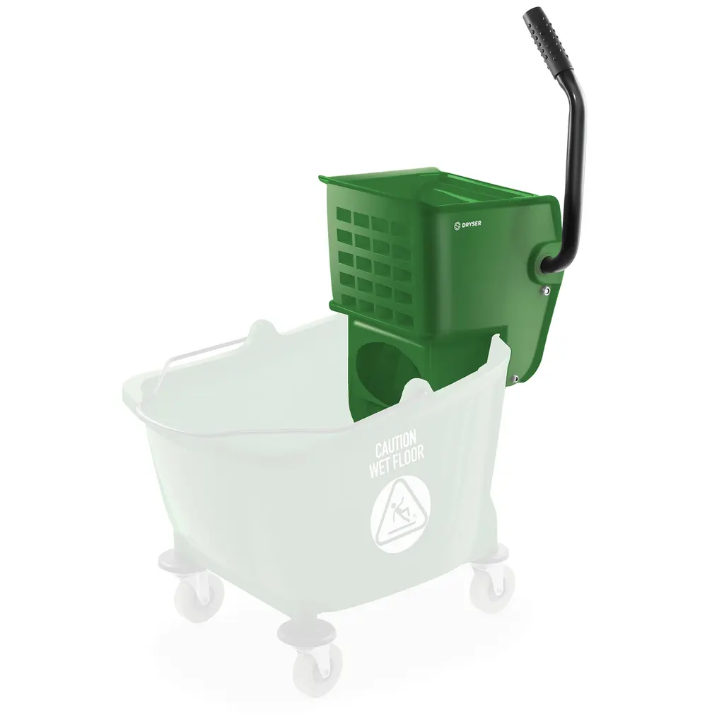 Universal Design: Wringer is for use with all 26 qt. and 33 qt. Dryser commercial mop buckets. The design is compatible with most other commercial mopping buckets using a side-press wringer system. Easy to install onto existing mopping buckets. It features universal mount points to accommodate a wide range of models, providing flexibility and convenience. Mop Bucket not included.Efficient: The wringer leverages a side-press mechanism that applies pressure evenly across the mop head, enabling efficient liquid extraction with less effort. This allows users to clean larger areas without experiencing fatigue, improving productivity in commercial environments.High Durability: Constructed with heavy-duty polypropylene, the wringer provides superior durability to withstand the daily rigors of commercialwashing. Its molded body design ensures a long lifespan, reducing the need for frequent replacements and minimizing maintenance costs.Adjustable Pressure System: The steel pressure rod spring was engineered for superior elasticity, so your wringer will operate smoothly press after press. Users can adjust the amount of pressure applied to the mop, optimizing liquid extraction, and ensuring a more efficient and effectivewashing process.Ergonomic Design: To promote user comfort and safety, the wringer is designed with ergonomic features such as a comfortable, easy-to-grip handle. The smooth wringing mechanism reduces strain on the back providing a safer and more comfortable user experience. Additionally, the shape and position of the handle allows for smoother steering. Wringer is for use with all 26 qt. and 33 qt. Dryser commercial mop buckets. The design is compatible with most other commercial mopping buckets using a side-press wringer system. Easy to install onto existing mopping buckets. It features universal mount points to accommodate a wide range of models, providing flexibility and convenience. The ergonomic, heavy-duty wringer handle has been designed to operate easily and with minimal effort. Additionally, the shape and position of the handle allows for smoother steering. Ideal for home, office, industrial, and professional environments. Wringer dimensions: 7.5” H x 9.35” W x 9.75” D. Mop Bucket not included.
