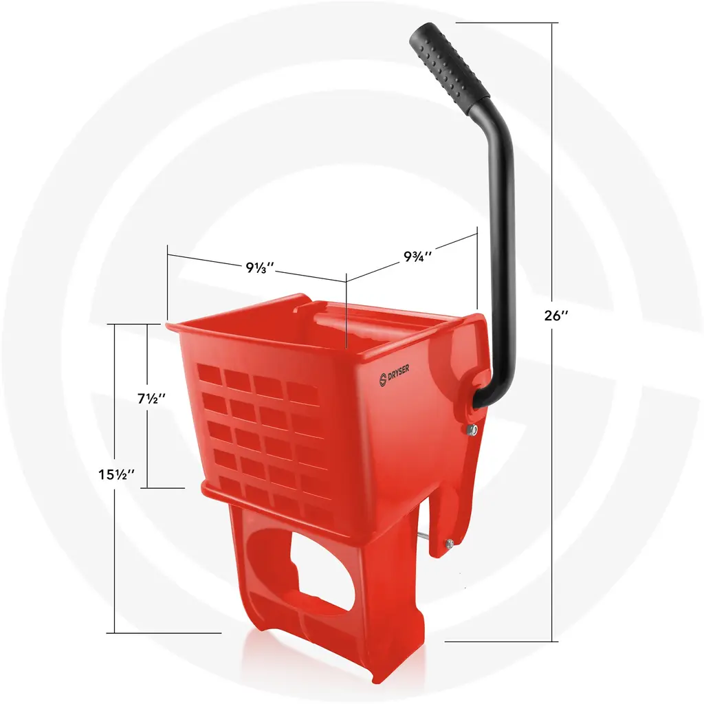 Universal Design: Wringer is for use with all 26 qt. and 33 qt. Dryser commercial mop buckets. The design is compatible with most other commercial mopping buckets using a side-press wringer system. Easy to install onto existing mopping buckets. It features universal mount points to accommodate a wide range of models, providing flexibility and convenience. Mop Bucket not included.Efficient: The wringer leverages a side-press mechanism that applies pressure evenly across the mop head, enabling efficient liquid extraction with less effort. This allows users to clean larger areas without experiencing fatigue, improving productivity in commercial environments.High Durability: Constructed with heavy-duty polypropylene, the wringer provides superior durability to withstand the daily rigors of commercialwashing. Its molded body design ensures a long lifespan, reducing the need for frequent replacements and minimizing maintenance costs.Adjustable Pressure System: The steel pressure rod spring was engineered for superior elasticity, so your wringer will operate smoothly press after press. Users can adjust the amount of pressure applied to the mop, optimizing liquid extraction, and ensuring a more efficient and effectivewashing process.Ergonomic Design: To promote user comfort and safety, the wringer is designed with ergonomic features such as a comfortable, easy-to-grip handle. The smooth wringing mechanism reduces strain on the back providing a safer and more comfortable user experience. Additionally, the shape and position of the handle allows for smoother steering. Wringer is for use with all 26 qt. and 33 qt. Dryser commercial mop buckets. The design is compatible with most other commercial mopping buckets using a side-press wringer system. Easy to install onto existing mopping buckets. It features universal mount points to accommodate a wide range of models, providing flexibility and convenience. The ergonomic, heavy-duty wringer handle has been designed to operate easily and with minimal effort. Additionally, the shape and position of the handle allows for smoother steering. Ideal for home, office, industrial, and professional environments. Wringer dimensions: 7.5” H x 9.35” W x 9.75” D. Mop Bucket not included.