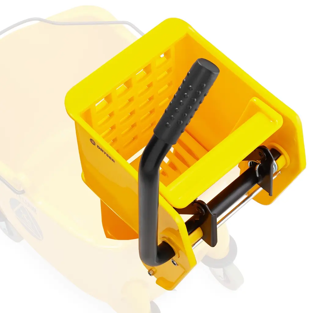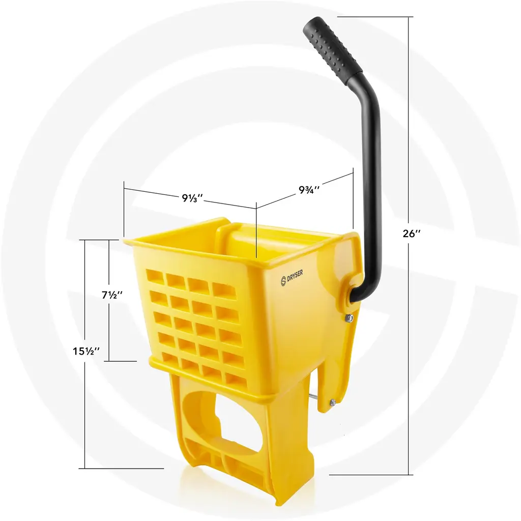 Universal Design: Wringer is for use with all 26 qt. and 33 qt. Dryser commercial mop buckets. The design is compatible with most other commercial mopping buckets using a side-press wringer system. Easy to install onto existing mopping buckets. It features universal mount points to accommodate a wide range of models, providing flexibility and convenience. Mop Bucket not included.Efficient: The wringer leverages a side-press mechanism that applies pressure evenly across the mop head, enabling efficient liquid extraction with less effort. This allows users to clean larger areas without experiencing fatigue, improving productivity in commercial environments.High Durability: Constructed with heavy-duty polypropylene, the wringer provides superior durability to withstand the daily rigors of commercialwashing. Its molded body design ensures a long lifespan, reducing the need for frequent replacements and minimizing maintenance costs.Adjustable Pressure System: The steel pressure rod spring was engineered for superior elasticity, so your wringer will operate smoothly press after press. Users can adjust the amount of pressure applied to the mop, optimizing liquid extraction, and ensuring a more efficient and effectivewashing process.Ergonomic Design: To promote user comfort and safety, the wringer is designed with ergonomic features such as a comfortable, easy-to-grip handle. The smooth wringing mechanism reduces strain on the back providing a safer and more comfortable user experience. Additionally, the shape and position of the handle allows for smoother steering. Wringer is for use with all 26 qt. and 33 qt. Dryser commercial mop buckets. The design is compatible with most other commercial mopping buckets using a side-press wringer system. Easy to install onto existing mopping buckets. It features universal mount points to accommodate a wide range of models, providing flexibility and convenience. The ergonomic, heavy-duty wringer handle has been designed to operate easily and with minimal effort. Additionally, the shape and position of the handle allows for smoother steering. Ideal for home, office, industrial, and professional environments. Wringer dimensions: 7.5” H x 9.35” W x 9.75” D. Mop Bucket not included.