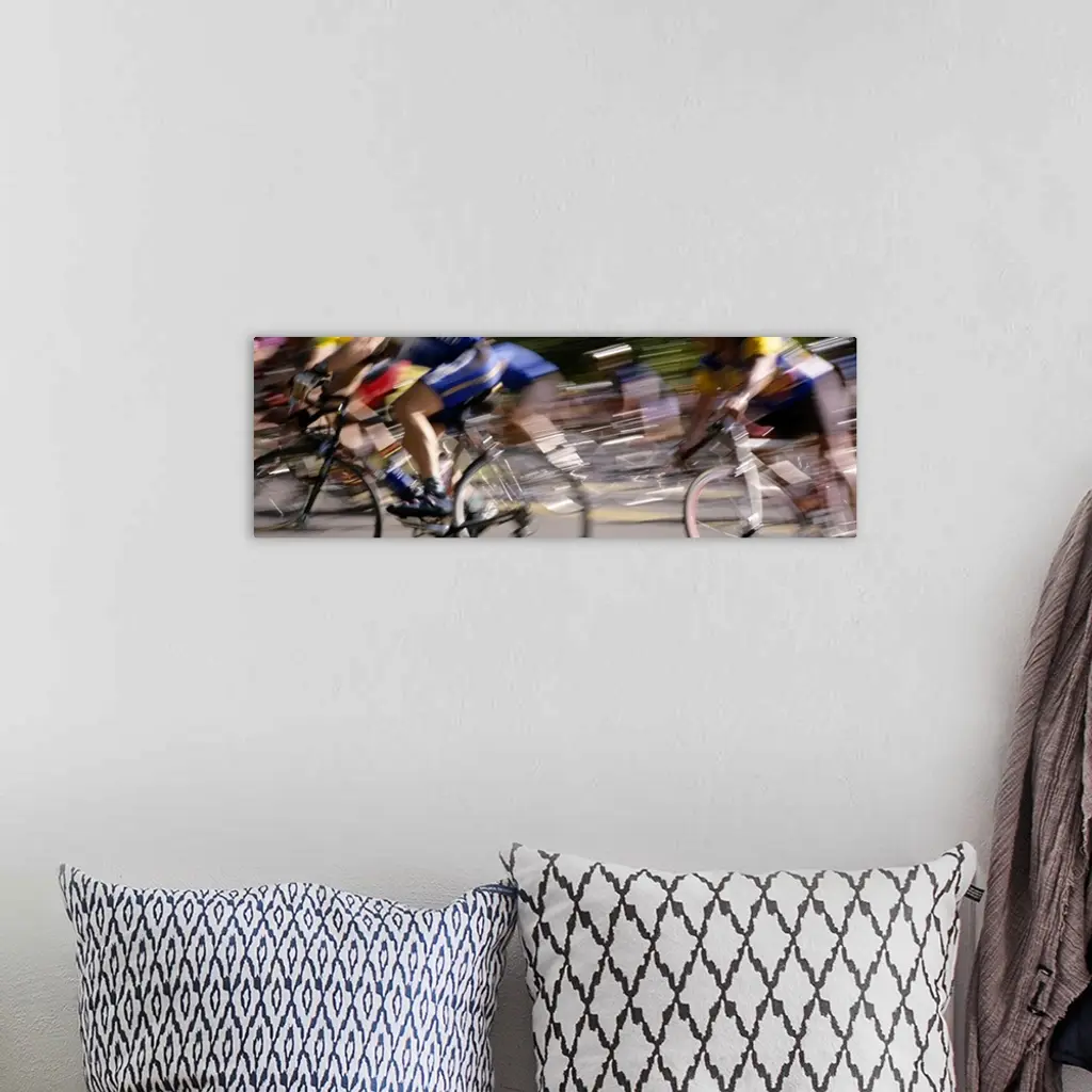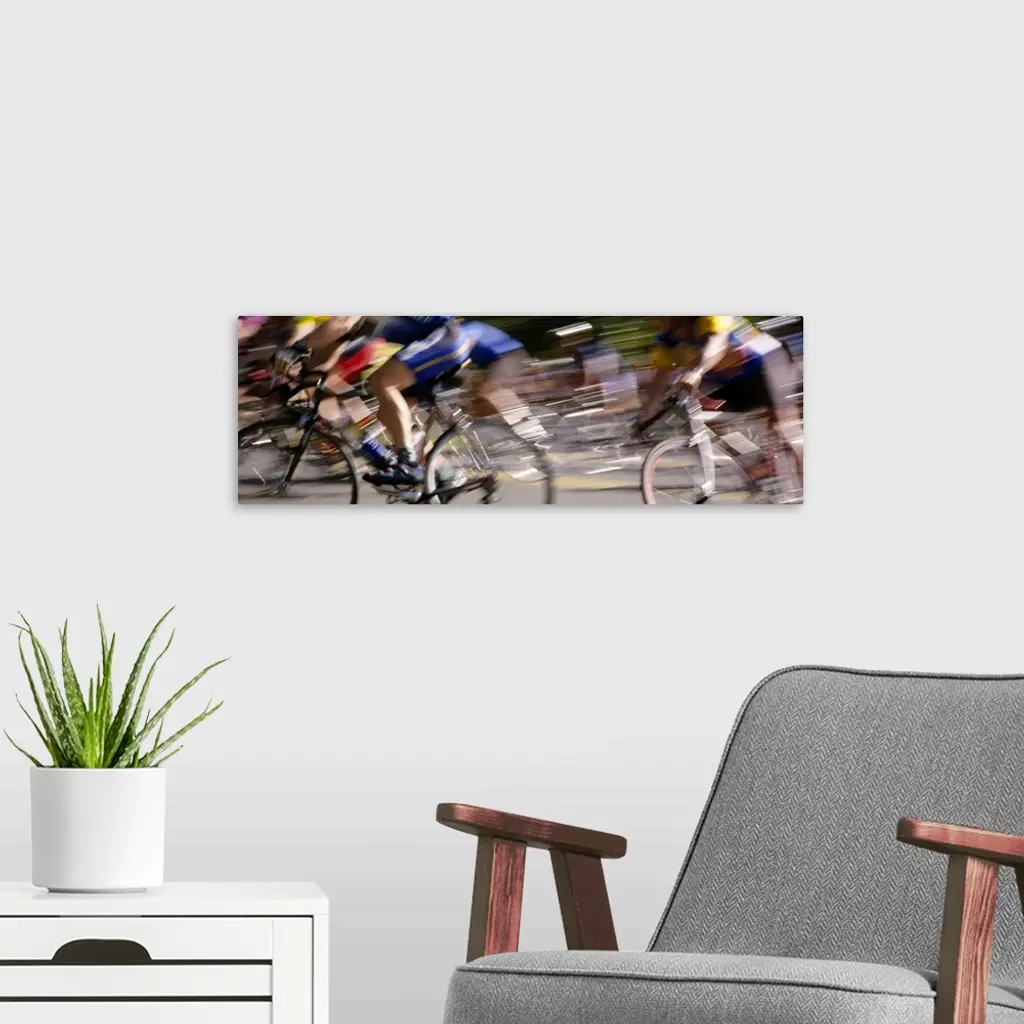 A panoramic photograph of racers on bicycles moving through the frame, blurred with motion.