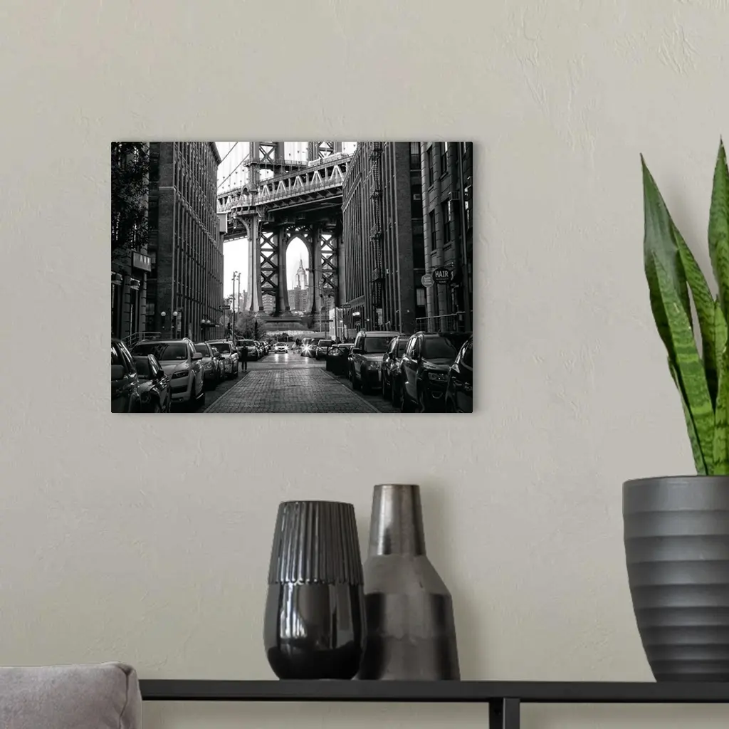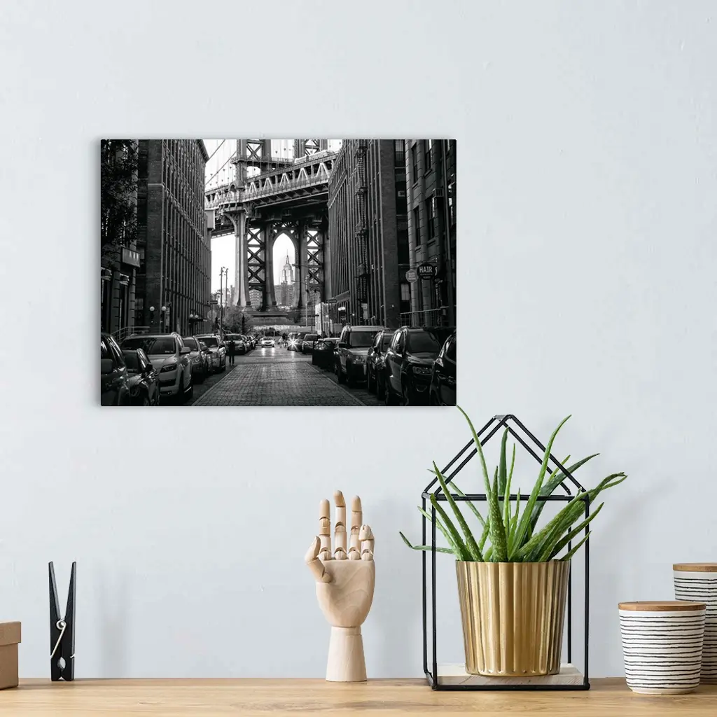 Sidestreet with a view of the Manhattan Bridge in New York City.