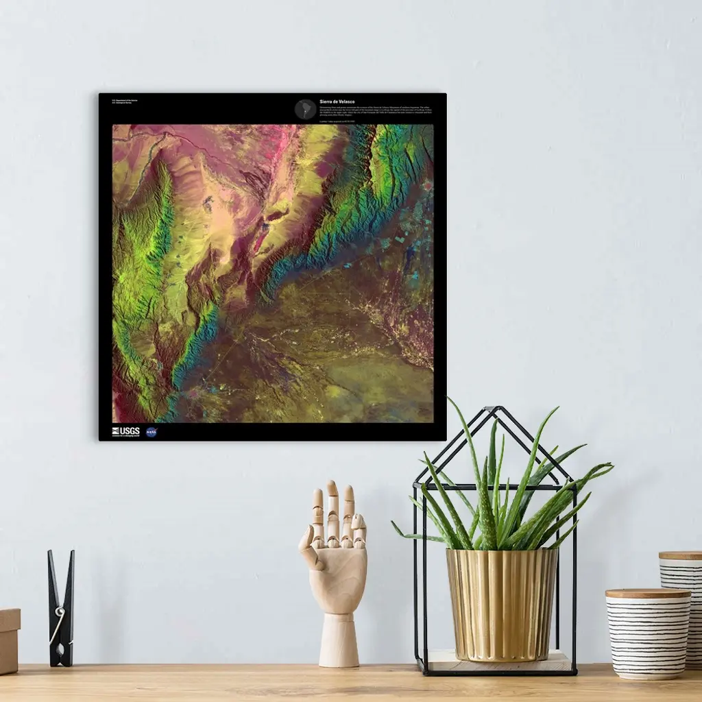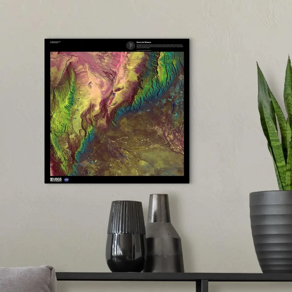Shimmering blues and greens accentuate the textures of the Sierra de Velasco Mountains of northern Argentina. The urban area (pinkish circle) near the lower left part of the mountain range is La Rioja, the capital of the province of La Rioja. Follow the foothills to the upper right, where the city of San Fernando del Valle de Catamarca lies near extensive vineyards and fruit-growing areas (blue blocky shapes). February 28, 1985.