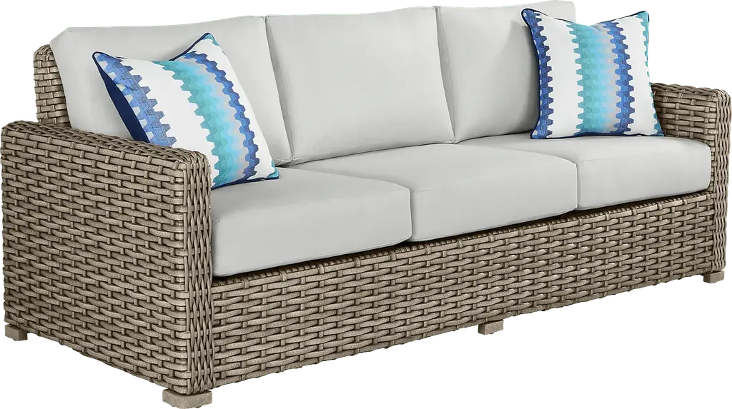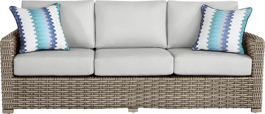 Make your outdoor space a relaxing destination with the Siesta Key seating set. The casual and comfortable sectional, with a durable rust-resistant powder coated aluminum frame, is crafted using large weave all-weather woven wicker in a driftwood finish. Dove gray outdoor cushions are UV resistant and sturdy, providing a beautiful look. Decorative toss pillows add the perfect accent while the coordinating glass top cocktail table provides a wonderful place for refreshments.