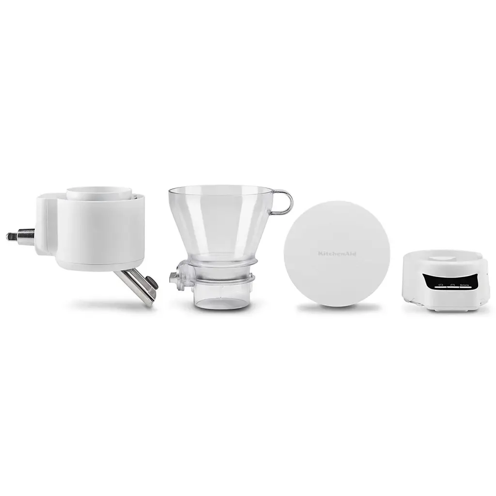 SIFTER + SCALE ATTACHMENT Quickly and easily achieve fluffy, consistent results with the revolutionary Sifter + Scale Attachment - the all-in-one baking tool that accurately measures, thoroughly sifts and automatically adds ingredients directly to your mixer bowl in just one step. Powered by the Mixer Simply attach the Sifter + Scale Attachment to the power hub of any KitchenAid® Stand Mixer. Then experience hands-free sifting as the sifter gradually incorporates ingredients into the mixer bowl. Battery operated scale. Automatic Sifter Hands-free sifting gives more consistent mixing and fluffy baked goods, and saves time during the process. Compared to unsifted ingredients. Easy-to-use Digital Scale Measures ingredients by weight for a greater level of precision, which is a critical part of successful baking. Can also be used separately on your countertop with the included scale plate. Additional Features GENEROUS CAPACITY HOPPER Holds up to 4 cups of dry ingredients at a time. CONVENIENT STORAGE Keep all parts in one place for quick access with the included storage case. EASY TO CLEAN All parts except scale and sifter housing are dishwasher-safe.