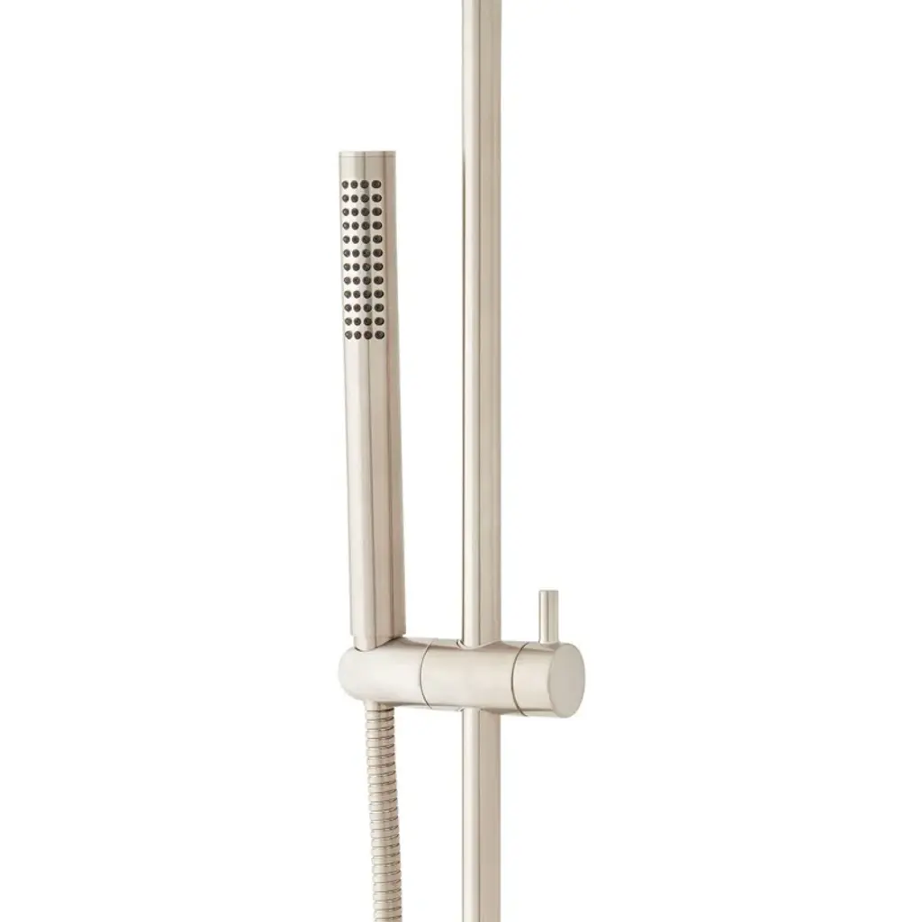 Finish your custom shower renovation with the contemporary tubular hand shower and slide bar. Situated on a sleek slide bar, this handheld cradle is height adjustable to suit your needs. Its hose provides the flexibility and reaches needed for effective rinsing.
