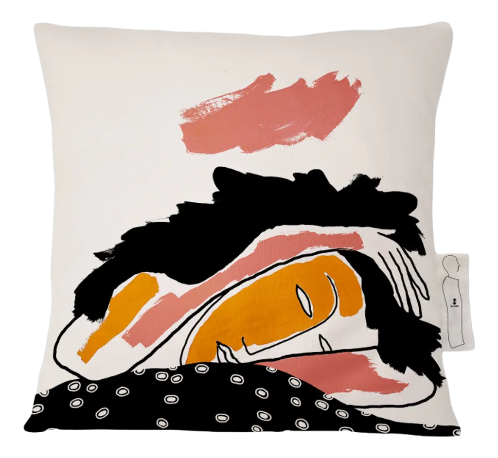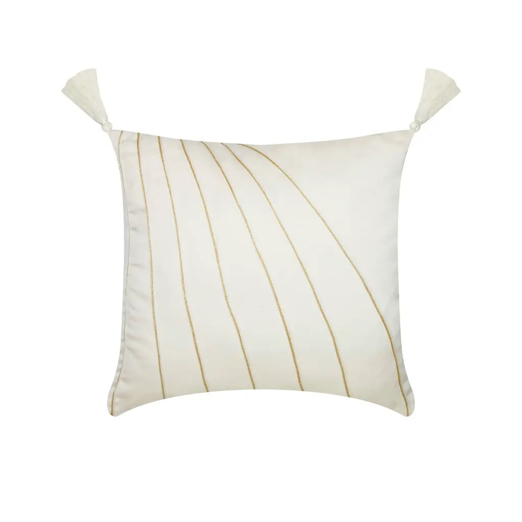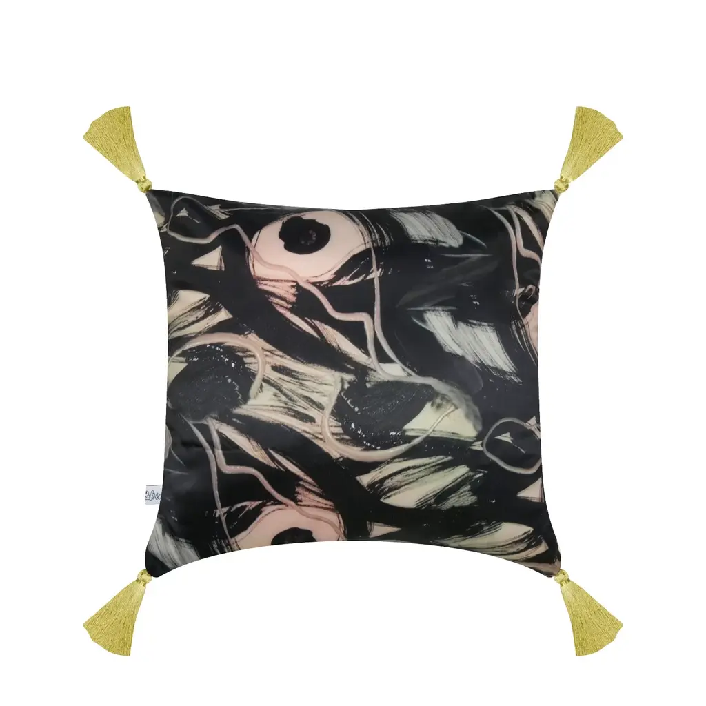 Signature print satine front and goldie geometric strap back cushion has tassle decorative detail around the edges. The cushion has zipped closure. The cushion comes with its inner cushion pad