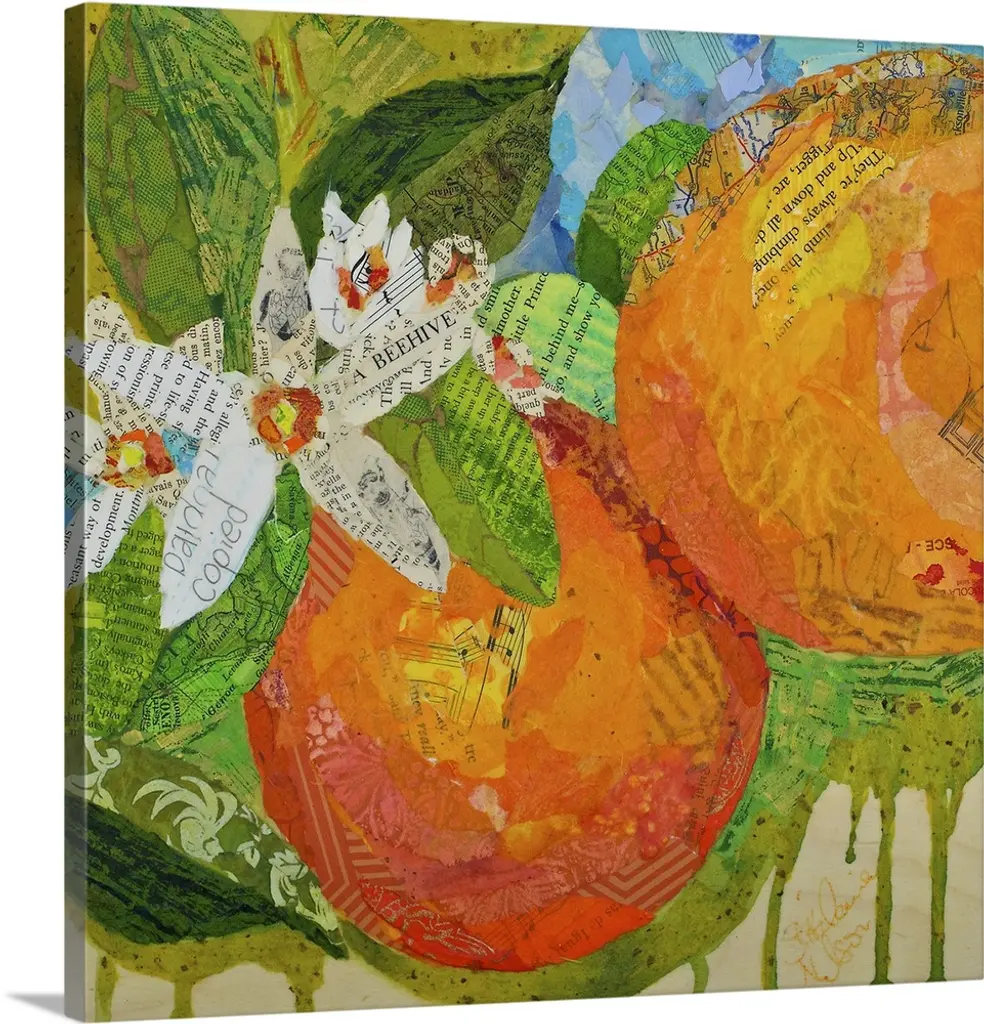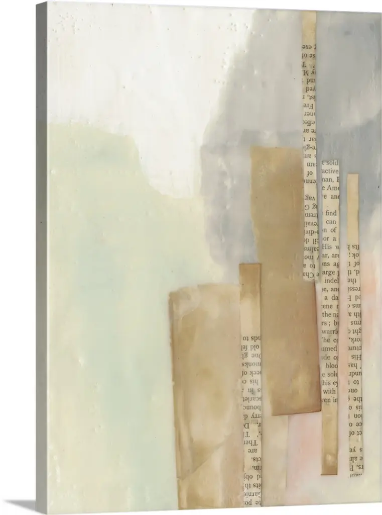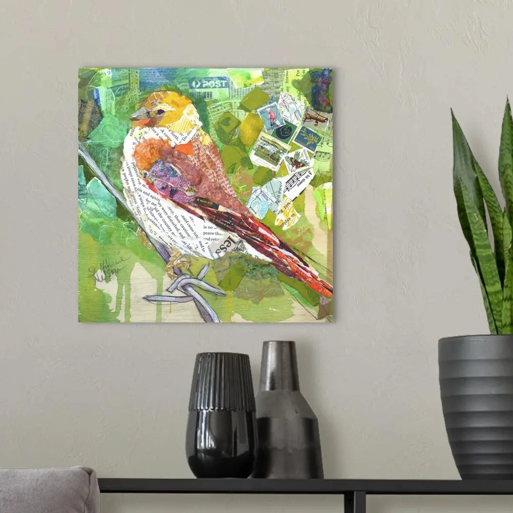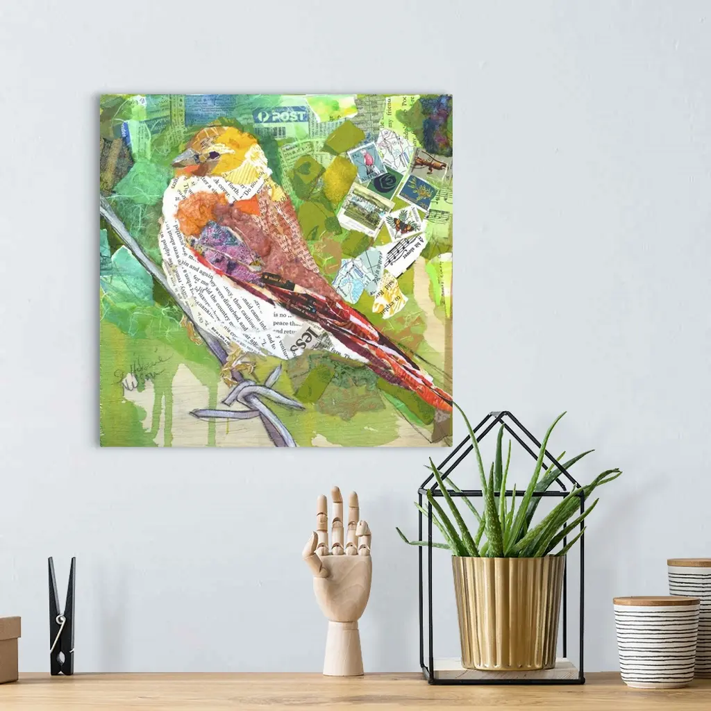 Creative collage of a bird perched on a branch with pieces with text and postage stamps.
