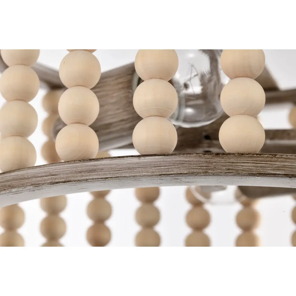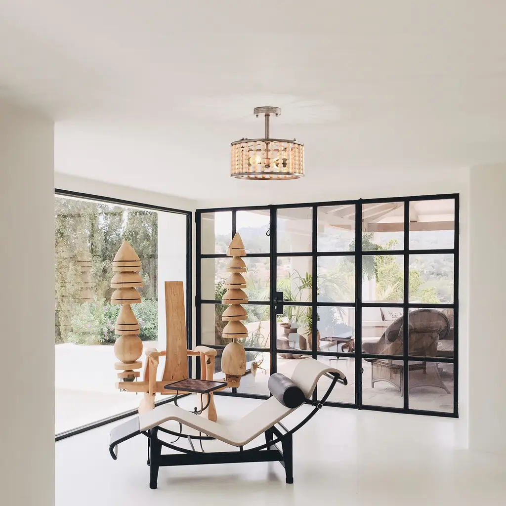 Boho chic meets modern glamour in this eye-catching semi-flush mount. Strands of cream wooden beads create a stunning interplay of light and shadow that enlivens any interior, making this semi-flush mount a must-have for clean-lined furnishings.Features:Dimensions:Note: This light is not damp rated. Whether it is dimmable or not depends on the light bulb not on the light fixture itself. If you use dimmable light bulb and a dimmer switch, it will be dimmable. This fixture does need to be hard wired. Assembly is required. Professional installation is recommended. This light cannot be installed on a sloped or vaulted ceiling.