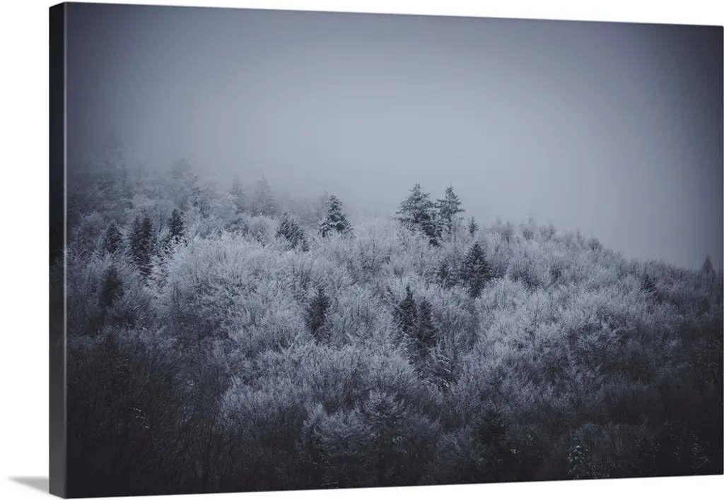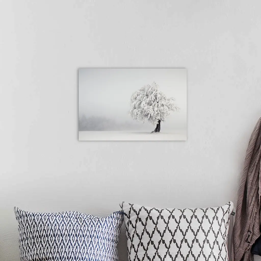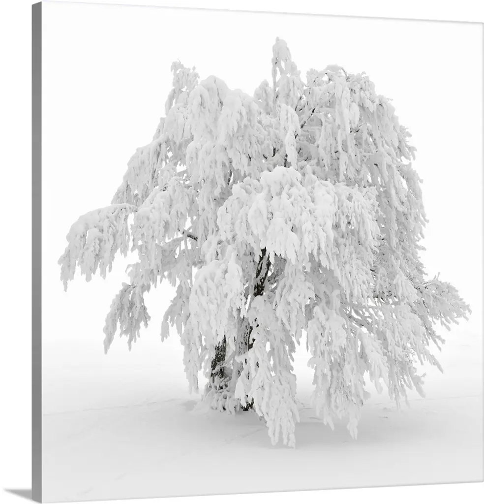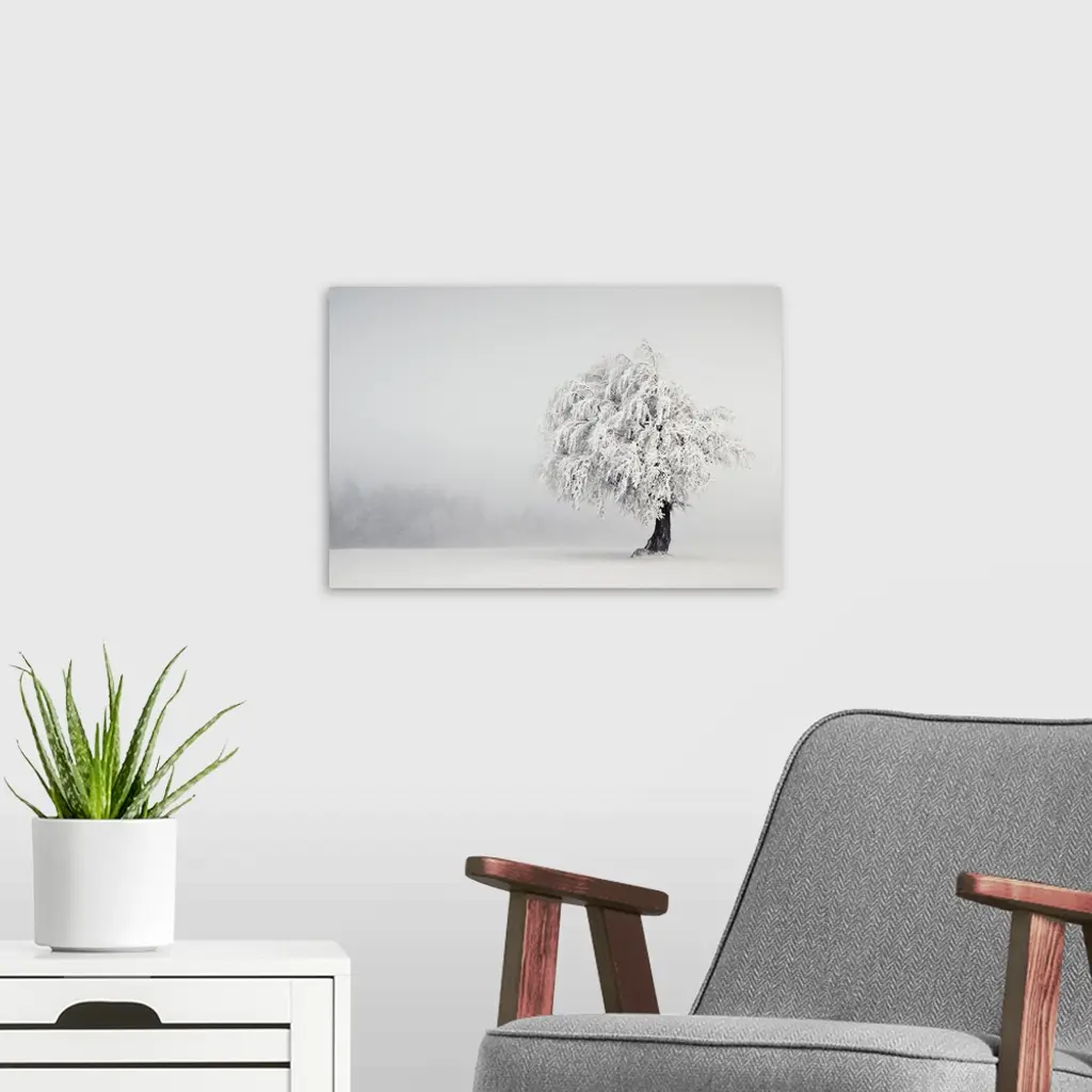 A lonely tree stands in a winter landscape, its branches heavy with snow.