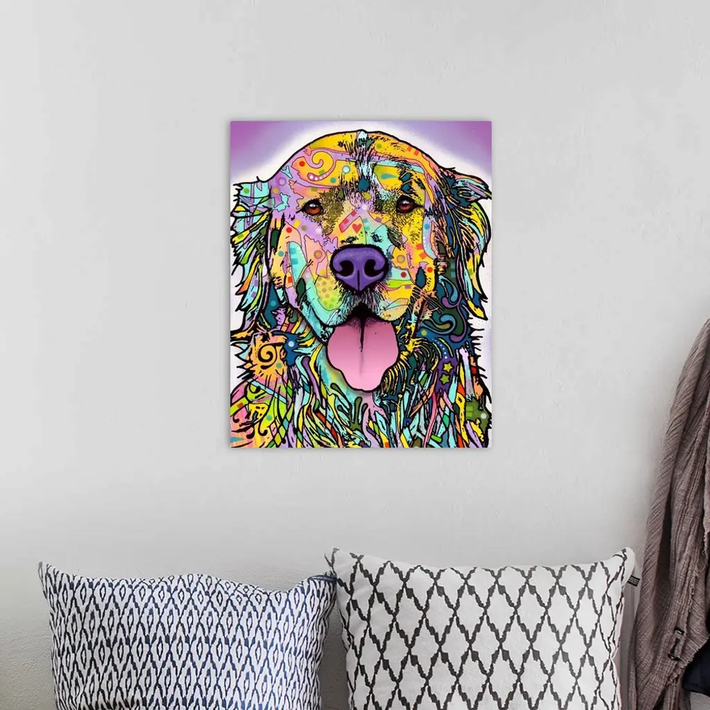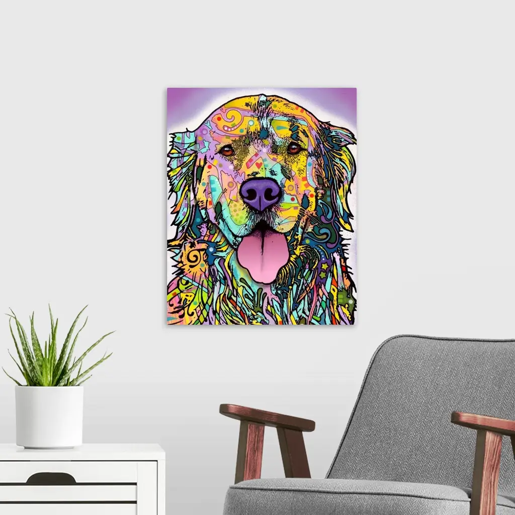 In this abstract portrait of a dog the outline of the animal is filled in with colorful and vibrant shapes and lines.