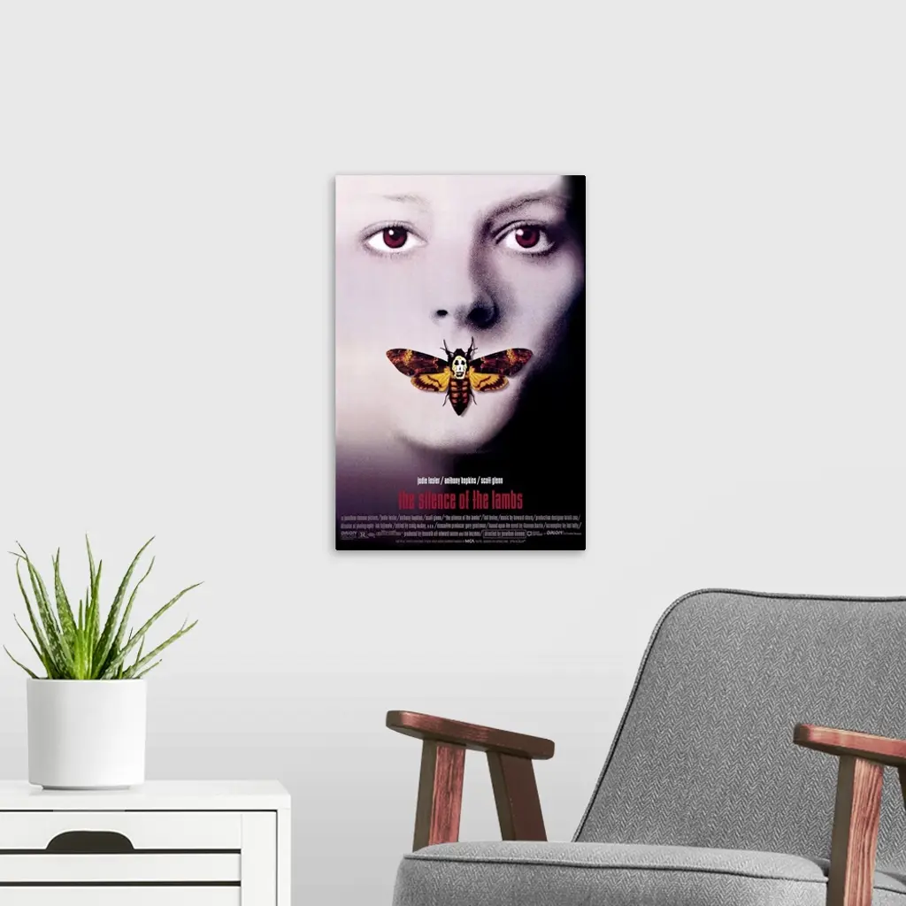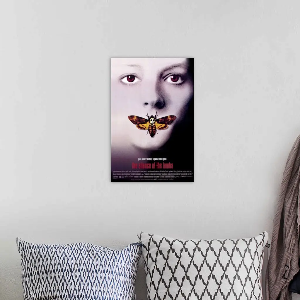 Vertical, oversized movie advertisement for the 1990 film, The Silence of the Lambs, starring Jodie Foster and Anthony Hopkins. The face of a young woman is surrounded by blackness, a foreign moth replaces her mouth.