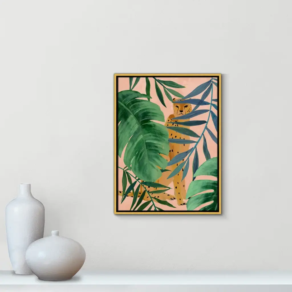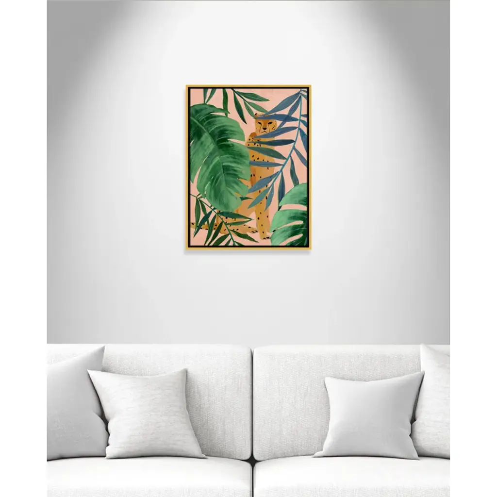 Spruce up your space with this playful, nature-inspired wall art. Vibrant palm fronds take center stage, while a cheeky cheetah peeks from a lively pink backdrop, adding a dash of whimsy to your walls. Choose your preferred medium – fine art paper or canvas – and your favorite frame color to make it uniquely yours. With a range of sizes and included hanging hardware, it's a breeze to install in any room. Plus, it's a surefire conversation starter at your next gathering.