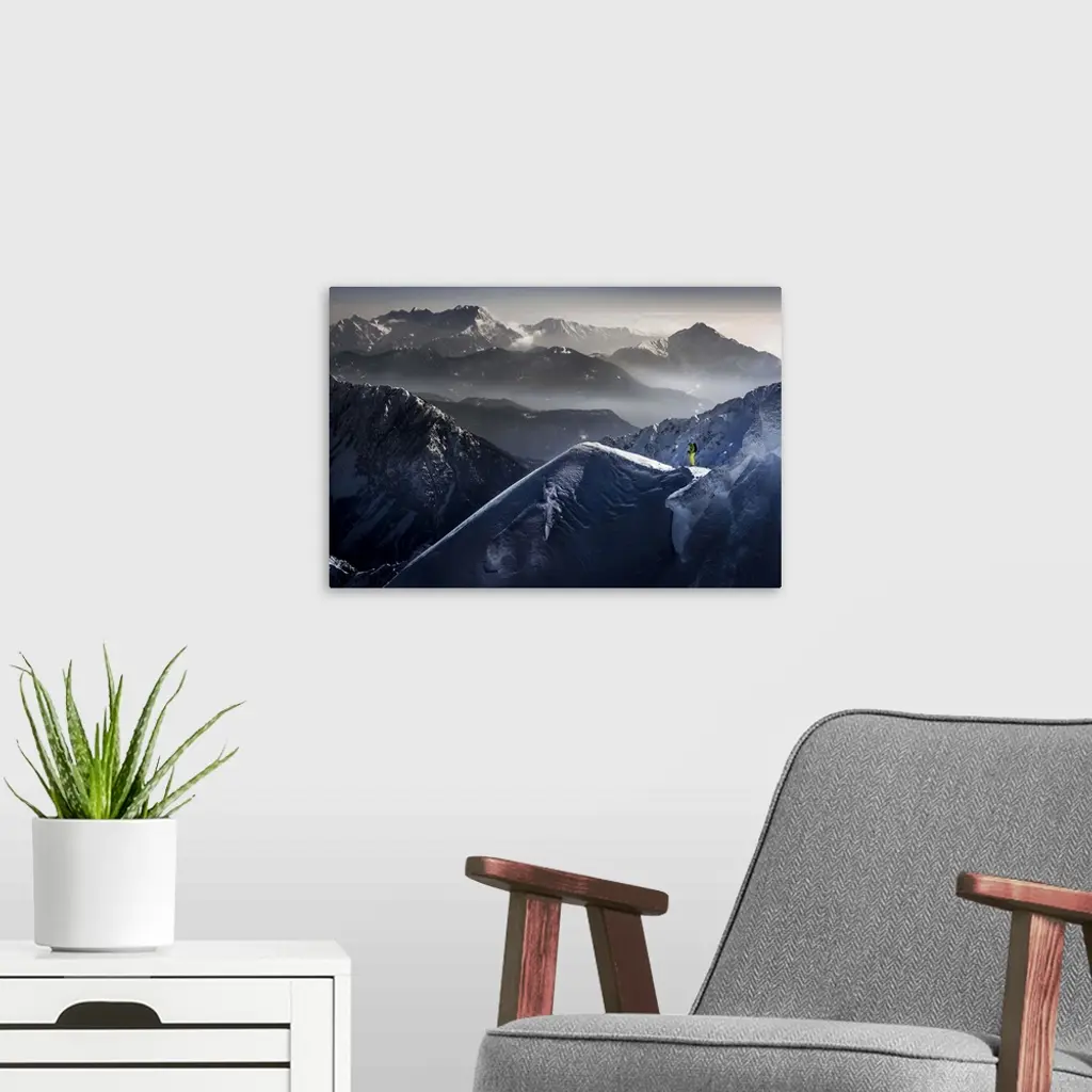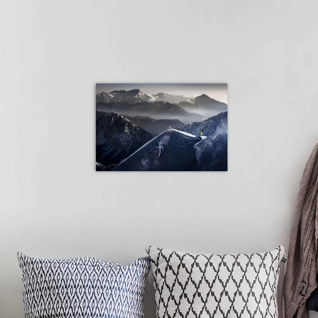 A skier pauses at the top of a mountain, with peaks of neighboring mountains in the background.
