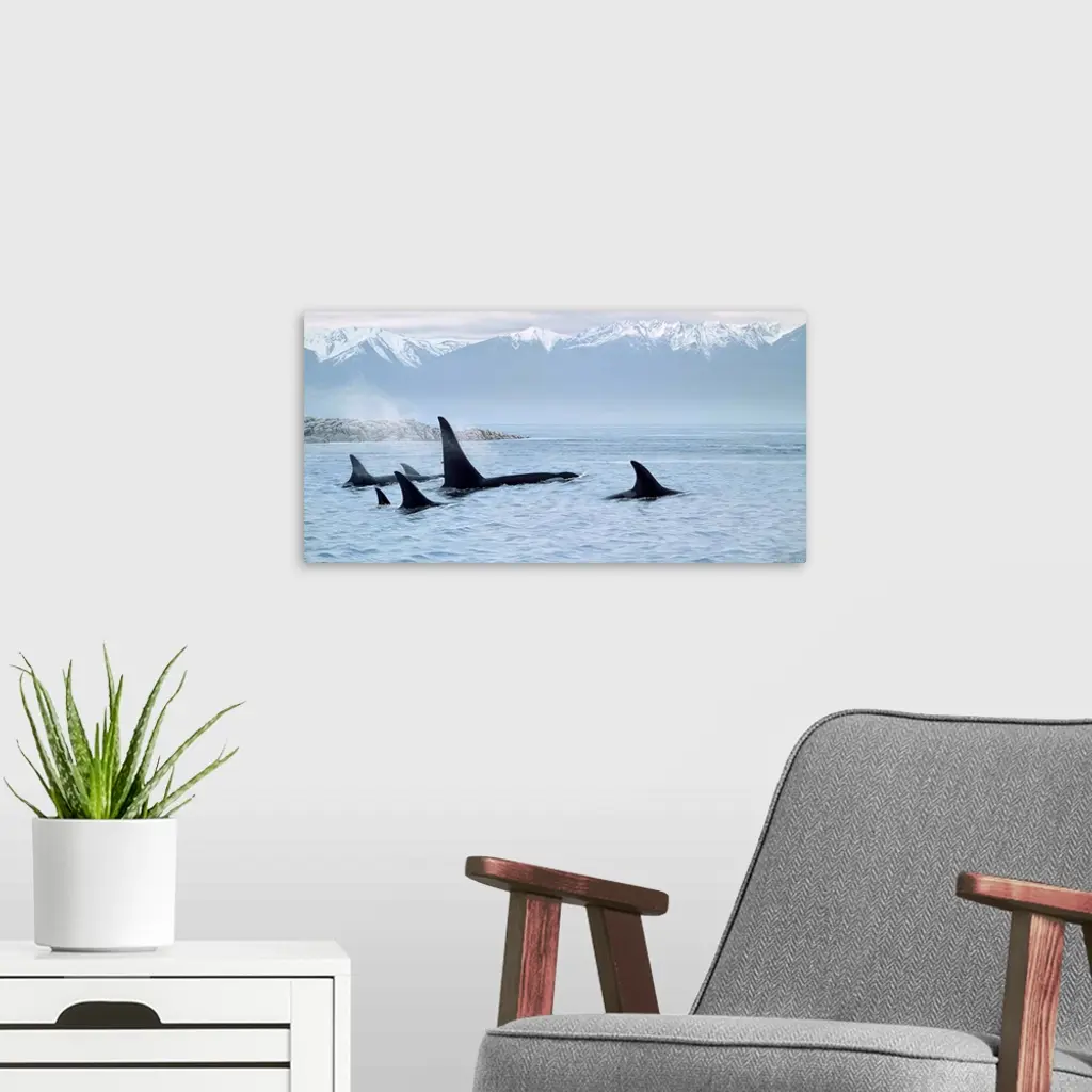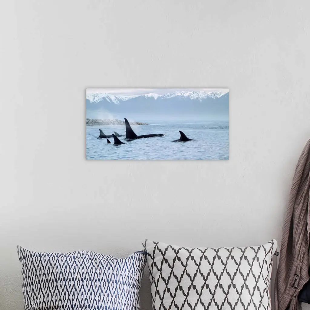 A group of whales travel through the water, the lands around them covered with snow.