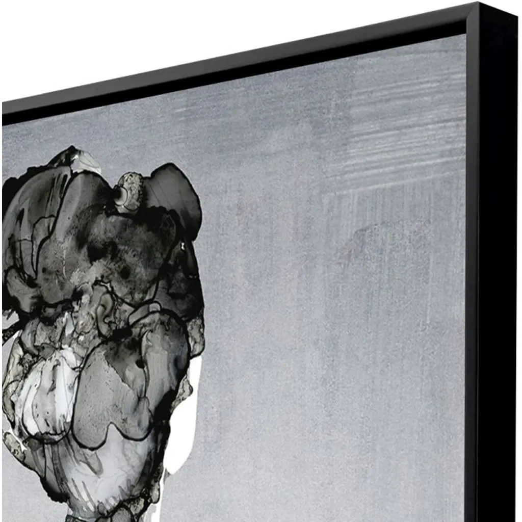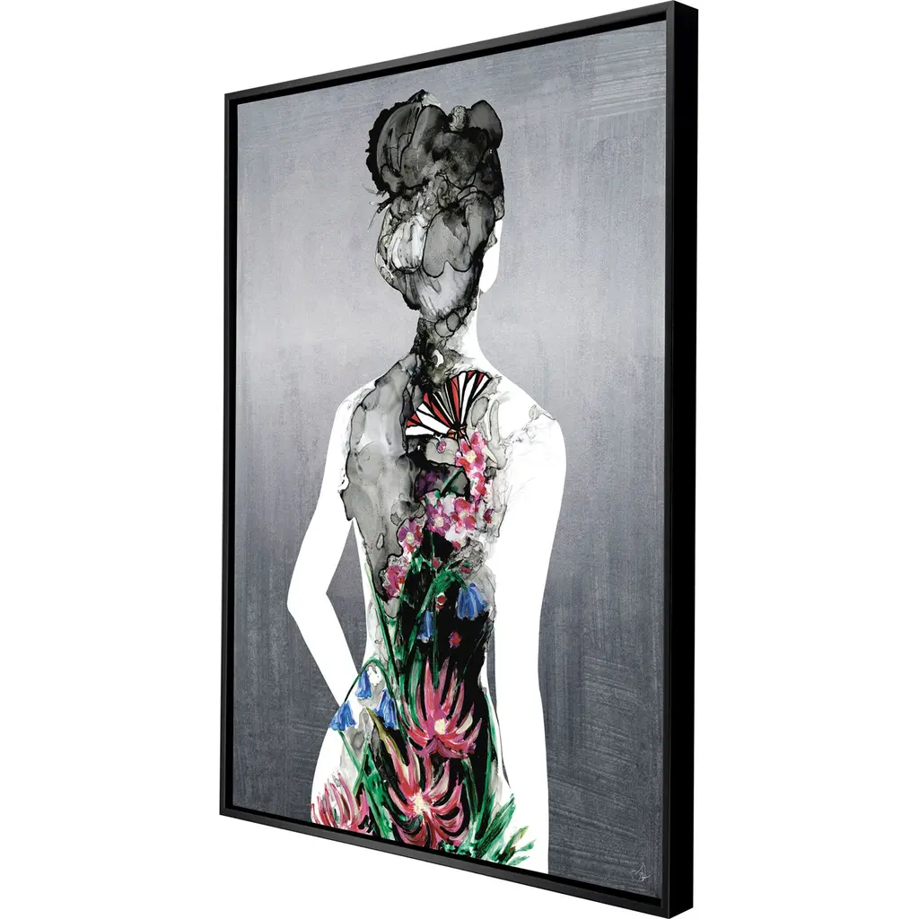 A contemporary figurative rendering in gray fuses with a colorful floral design. Canvas is mounted in a satin black floater frame.