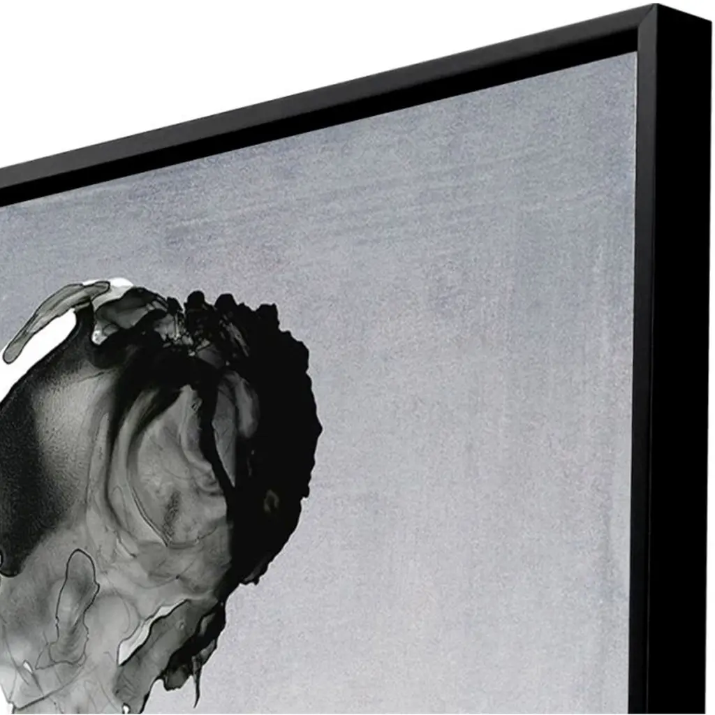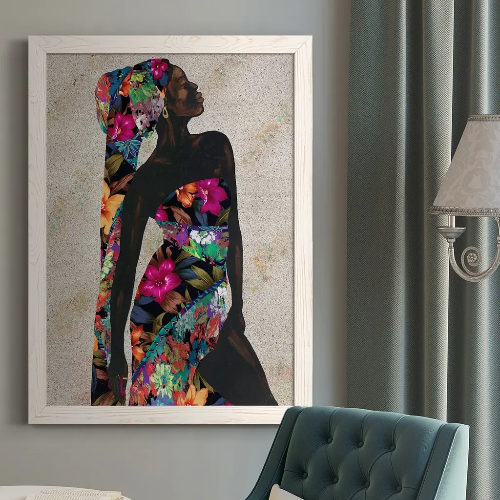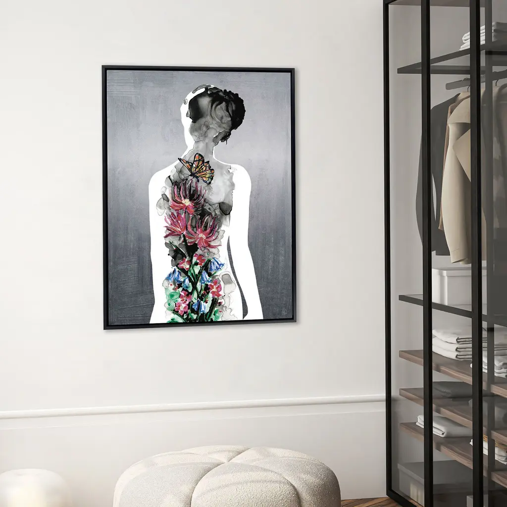 A contemporary figurative rendering in gray fuses with a colorful floral design. Canvas is mounted in a satin black floater frame.
