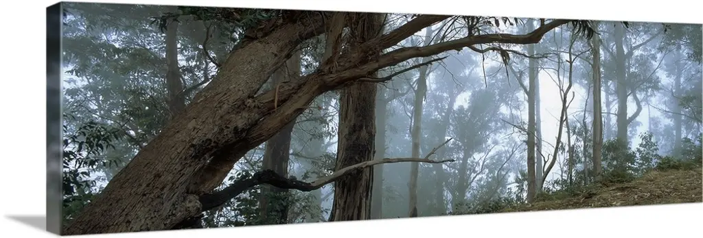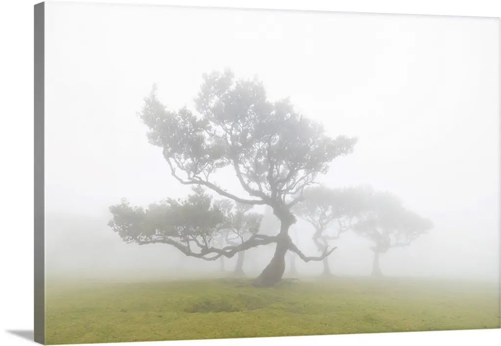 This large tree stands alone in a field with a layer of fog sitting just behind it.
