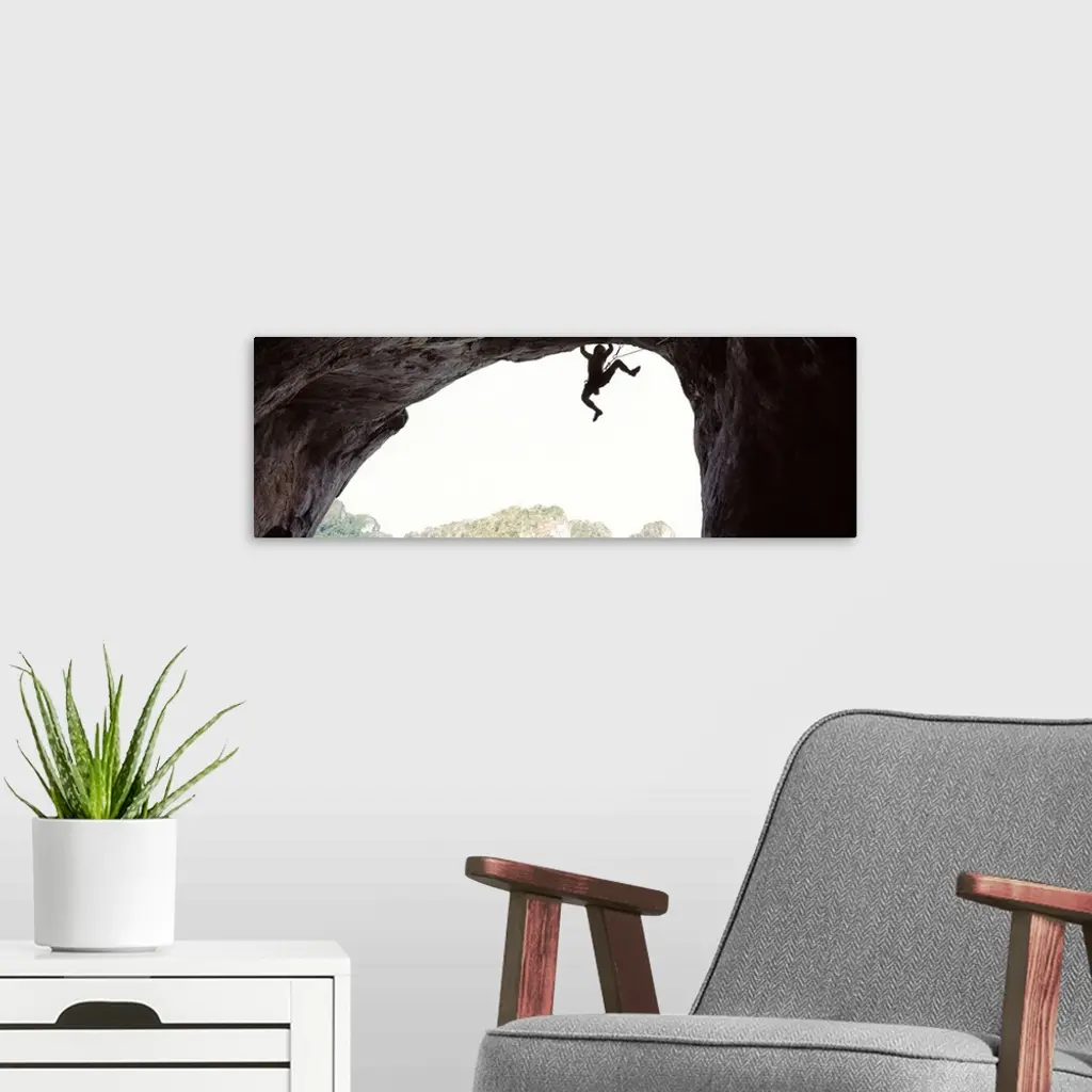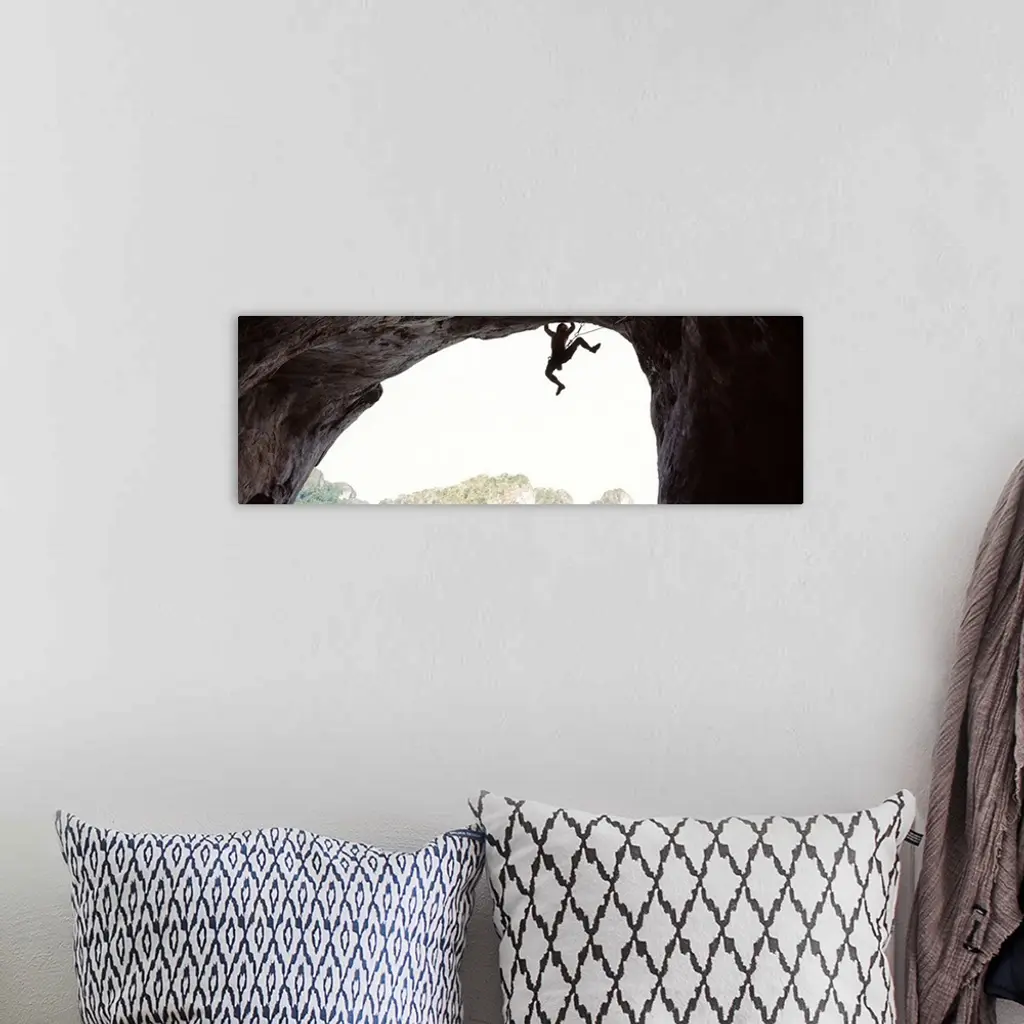 Silhouette of a man climbing a rock, Railay beach, Krabi, Thailand wall art for home and office decor. Discover canvas art prints, photos, mural, big canvas art and framed wall art in GreatBigCanvas.com's varied collections.